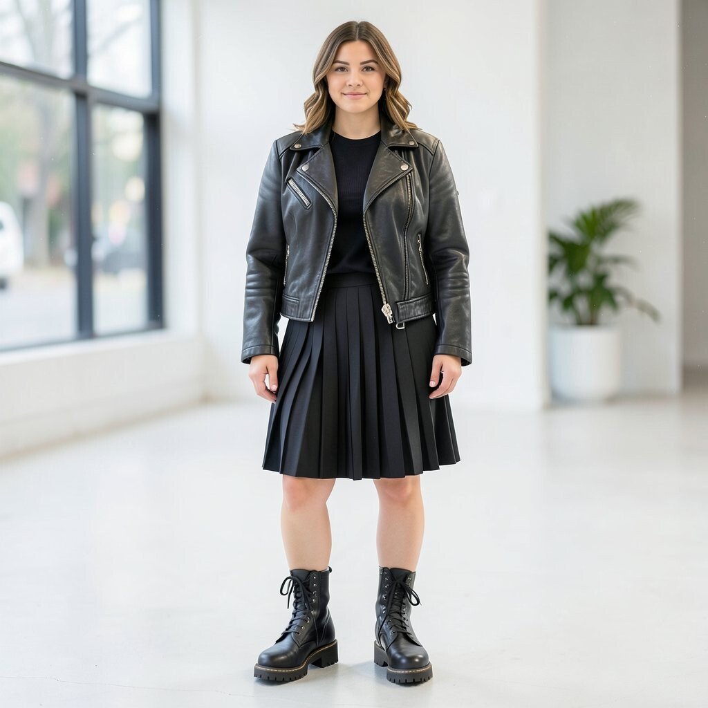 A leather jacket paired with a pleated skort adds an edgy twist to a classic look. This combination is perfect for a concert or a night out.