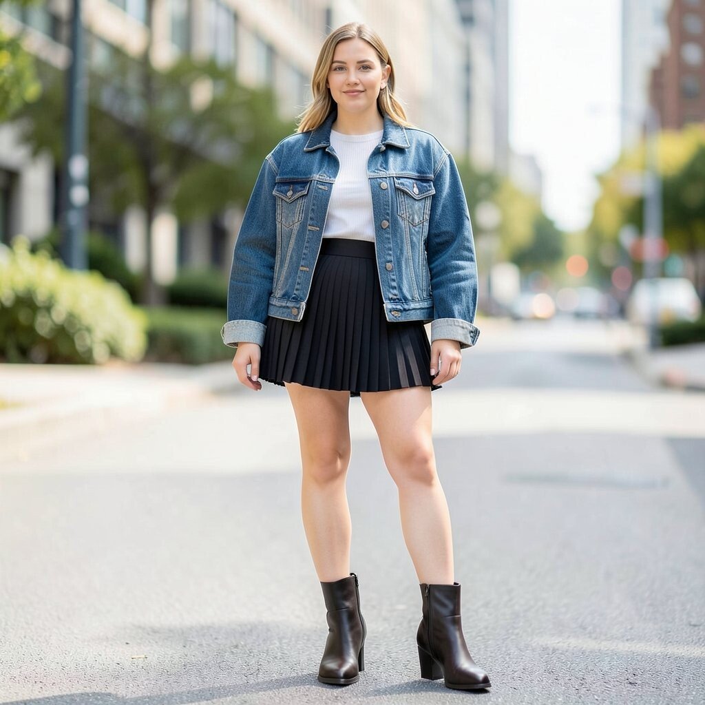 Combining a denim jacket with a pleated skort makes for a chic, layered outfit. This combination works well for cooler temperatures.