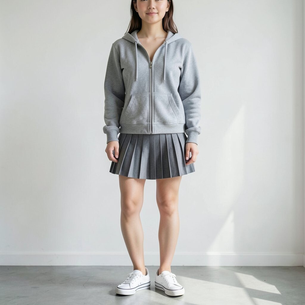 A zip-up hoodie paired with a pleated skort creates a sporty and casual vibe. This outfit is ideal for an active day or a walk in the park.