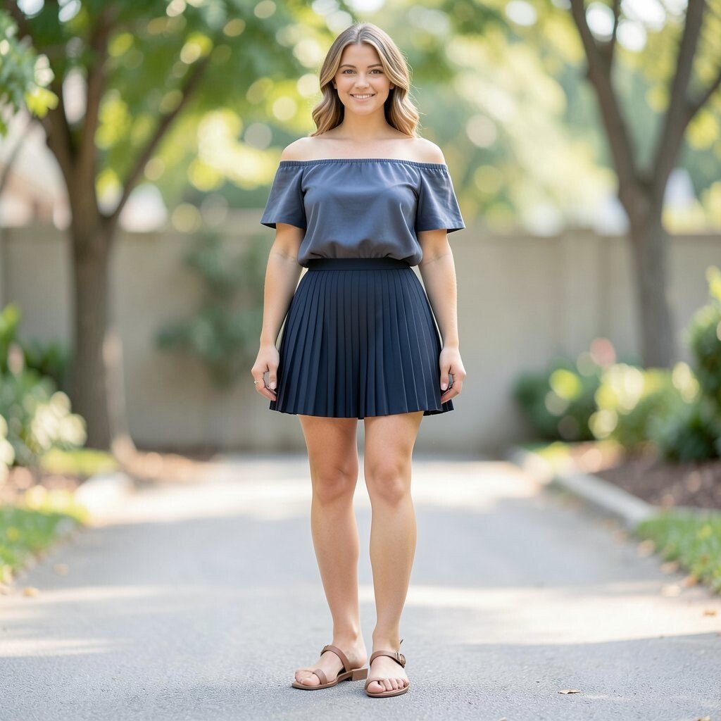 An off-shoulder top adds a romantic touch to a pleated skort, creating a feminine and flirty look. This outfit is perfect for a date night or a summer party.