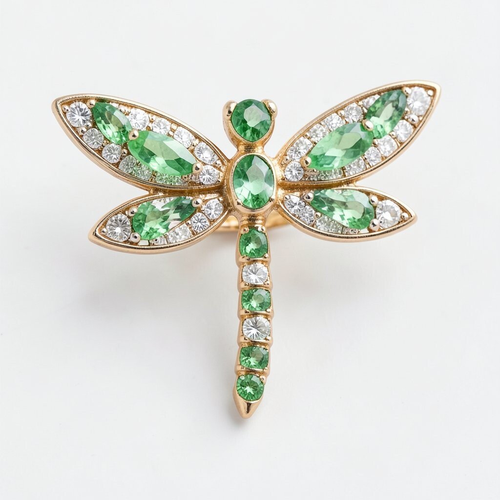 A peridot and diamond dragonfly brooch is light, bright, and full of motion. The green stones and clear sparkle make the wings seem almost ready to fly.