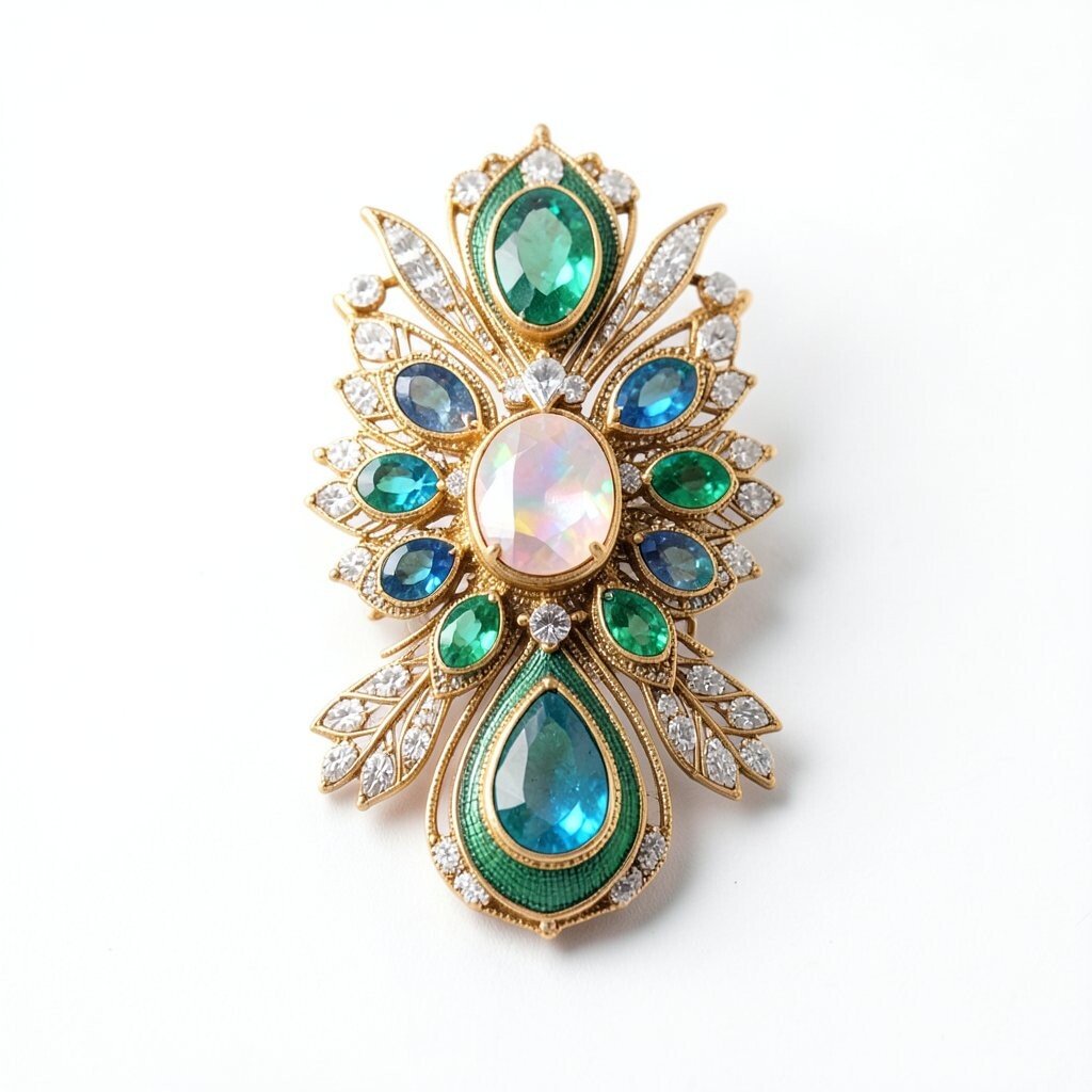 A ruby and emerald crown brooch feels bold, royal, and full of color. The red and green stones create a rich contrast that stands out fast.