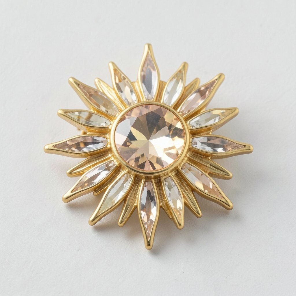 For a more personal touch, choose a sun shape with curved rays or tiny crystal accents. If you are watching your budget, a gold-tone brooch with topaz-colored stones can give a similar effect at a lower price.