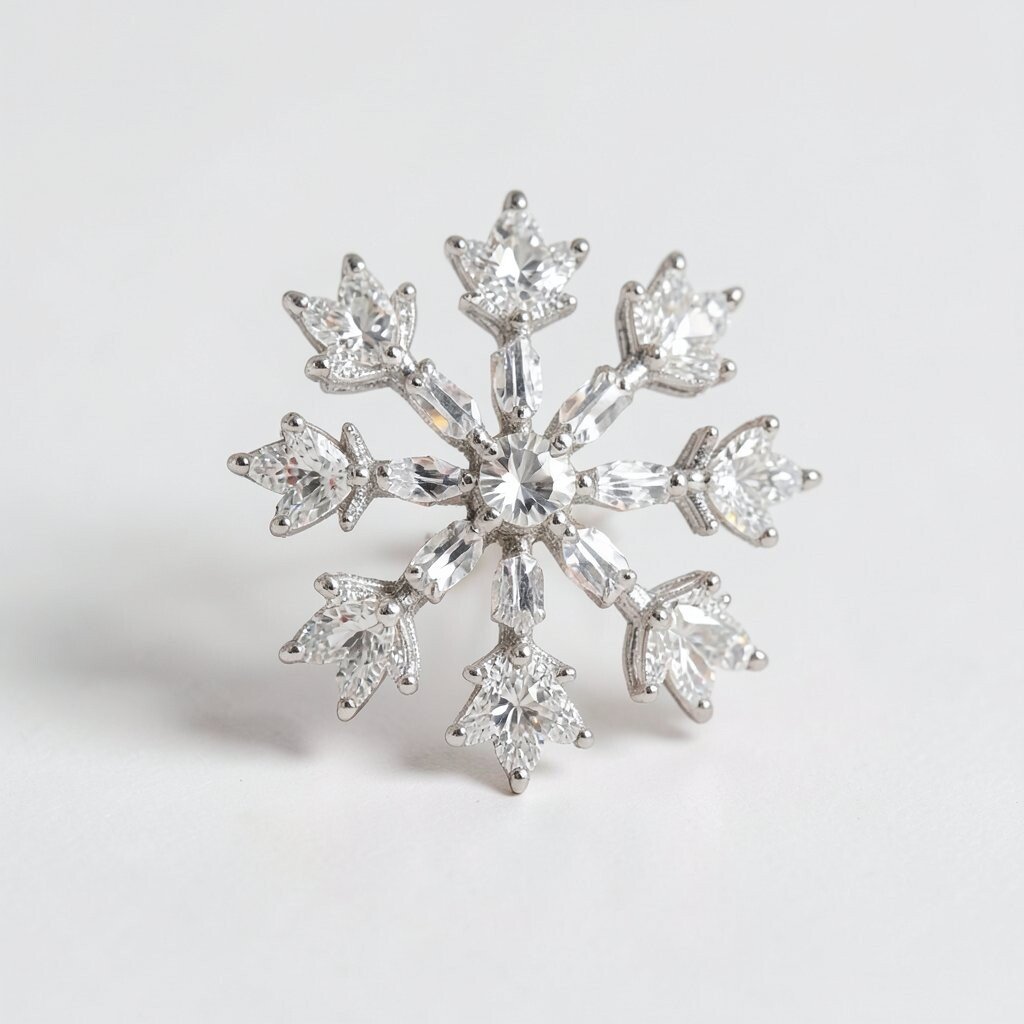 A diamond snowflake brooch sparkles like fresh winter frost. The clear stones make the shape look crisp, bright, and elegant.