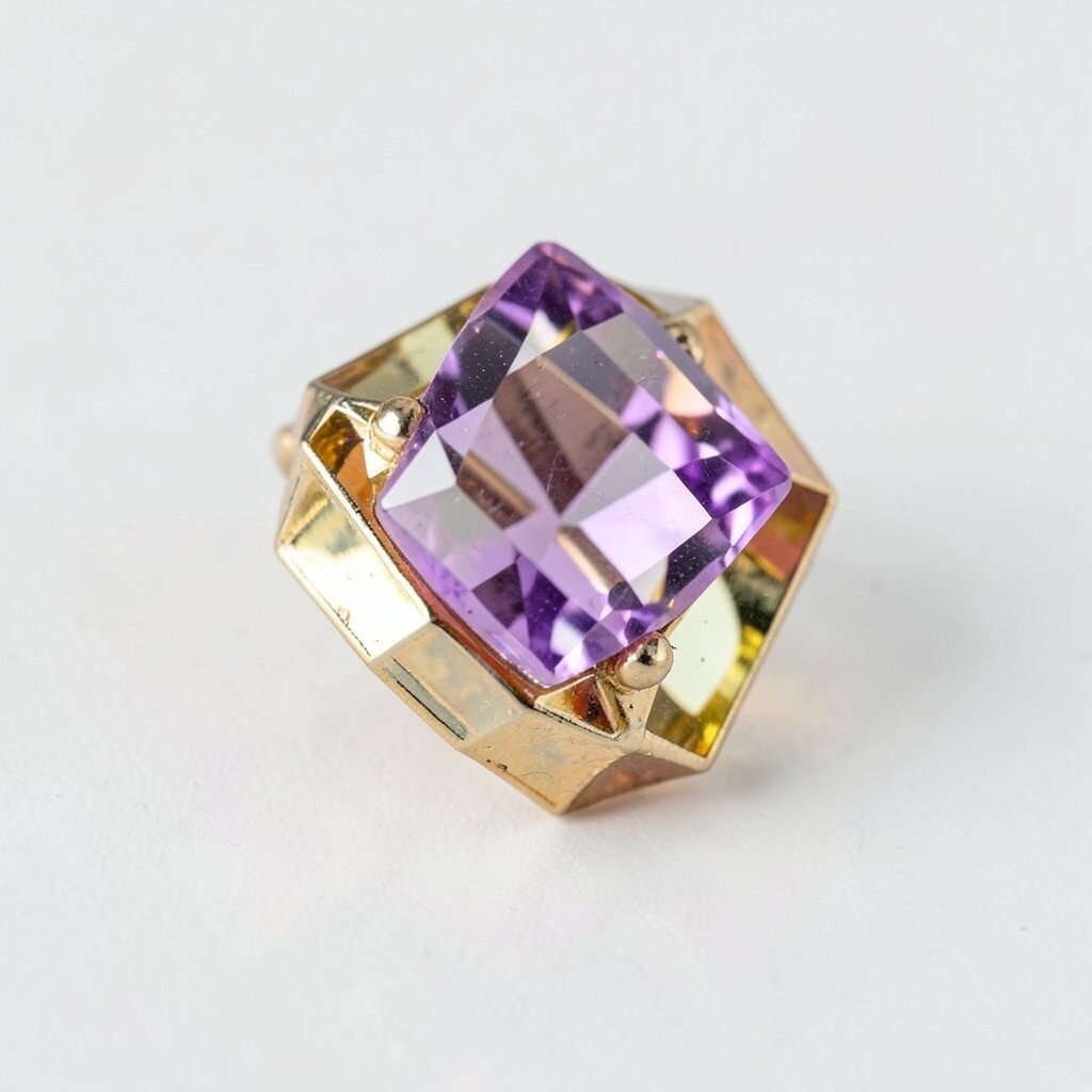 An amethyst and citrine geometric brooch mixes purple and yellow in a sharp, modern shape. The clean lines give it a fresh look that feels stylish and smart.