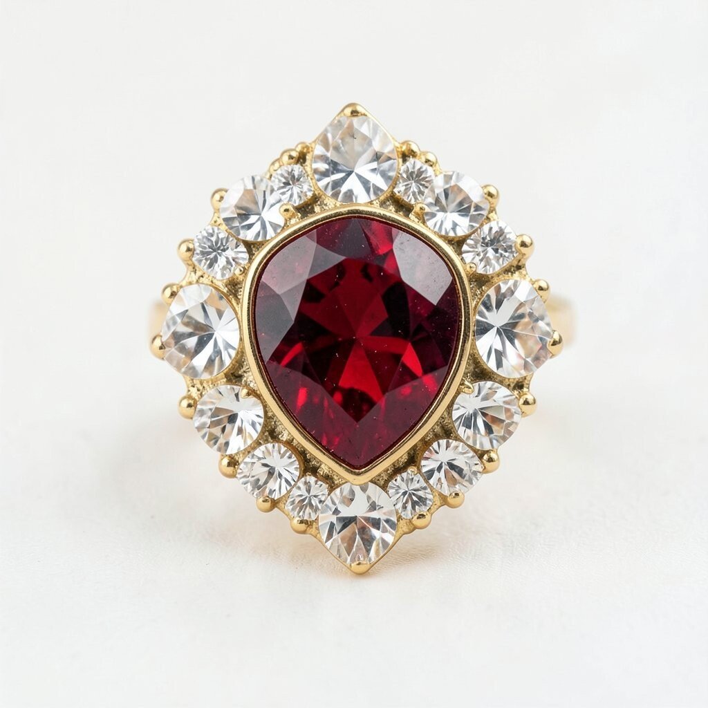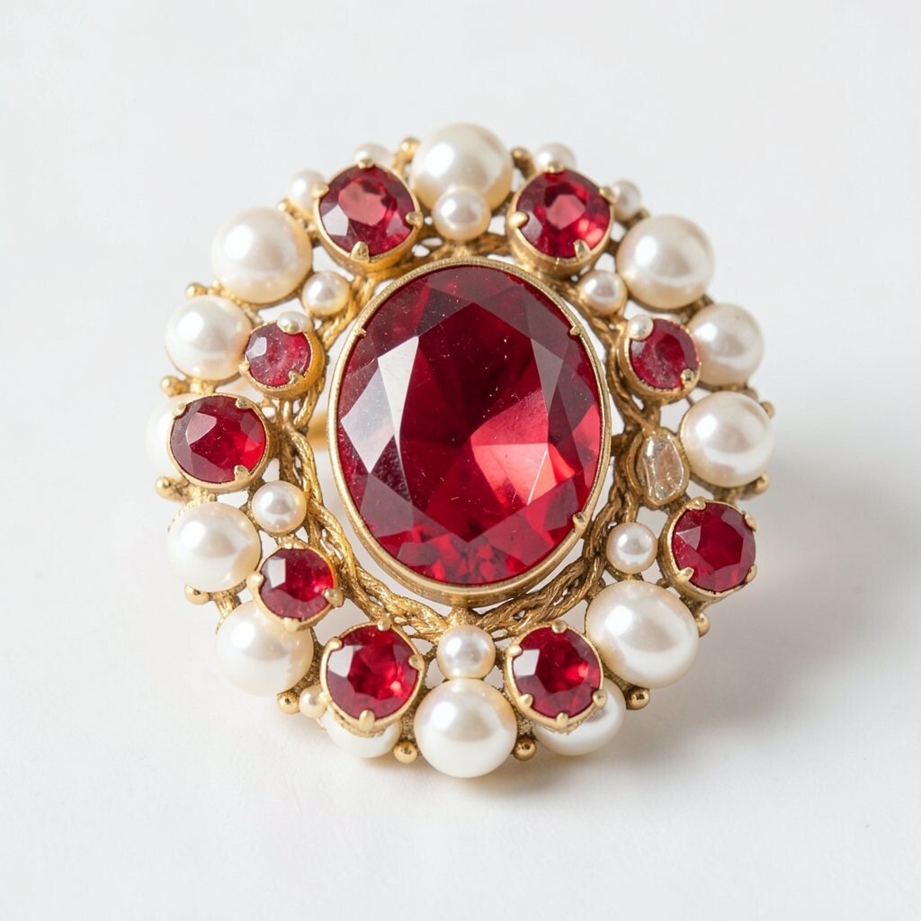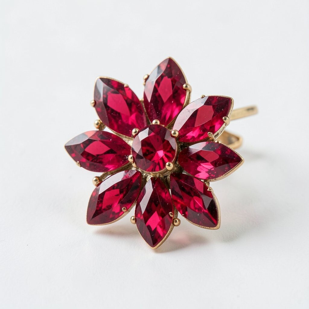 A ruby floral brooch glows with rich red stones arranged in petals. The look is warm, romantic, and full of charm.