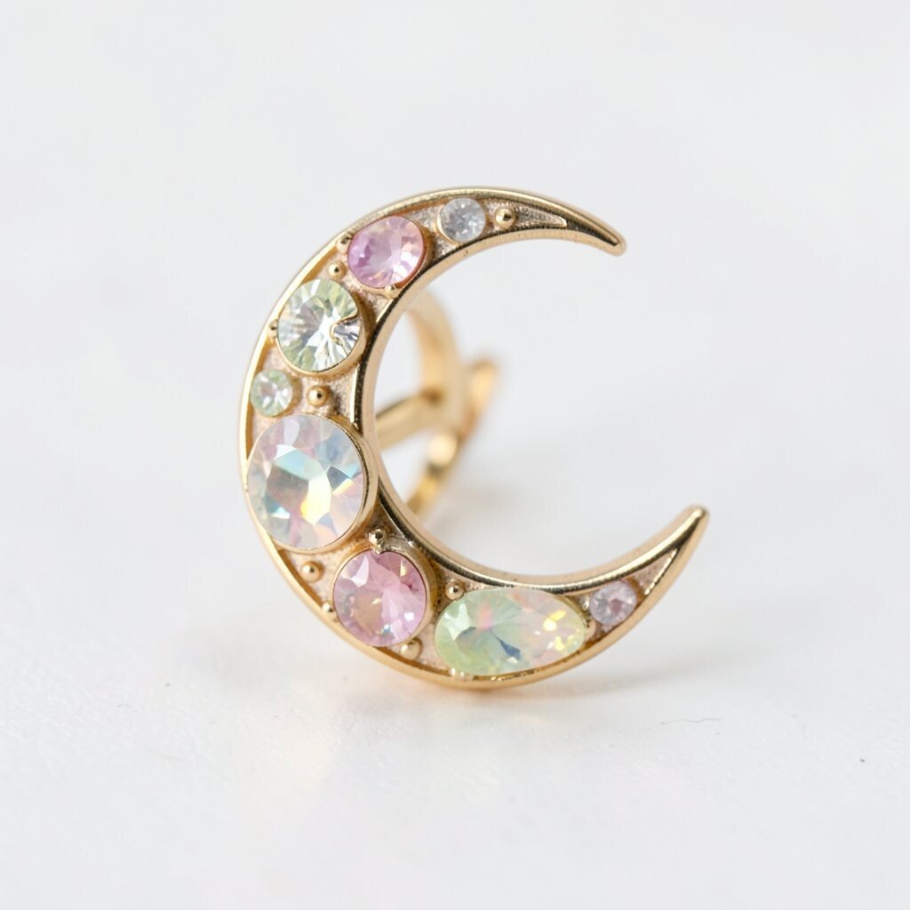 An opal moon brooch has a soft glow that changes in the light. The curved moon shape gives it a dreamy and magical look.