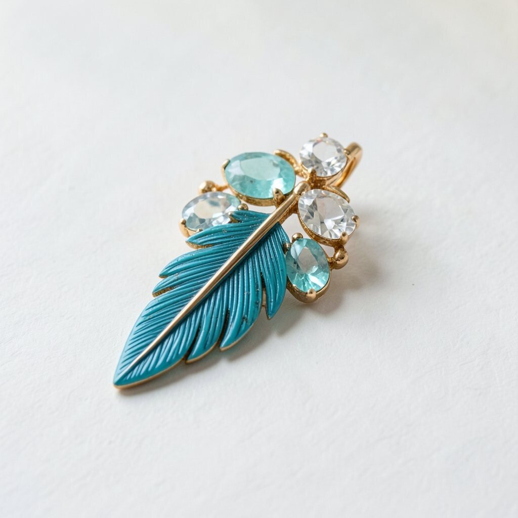 A turquoise feather brooch has a light, airy look that feels graceful and free. The blue-green stones make the feather shape look vivid and fun.
