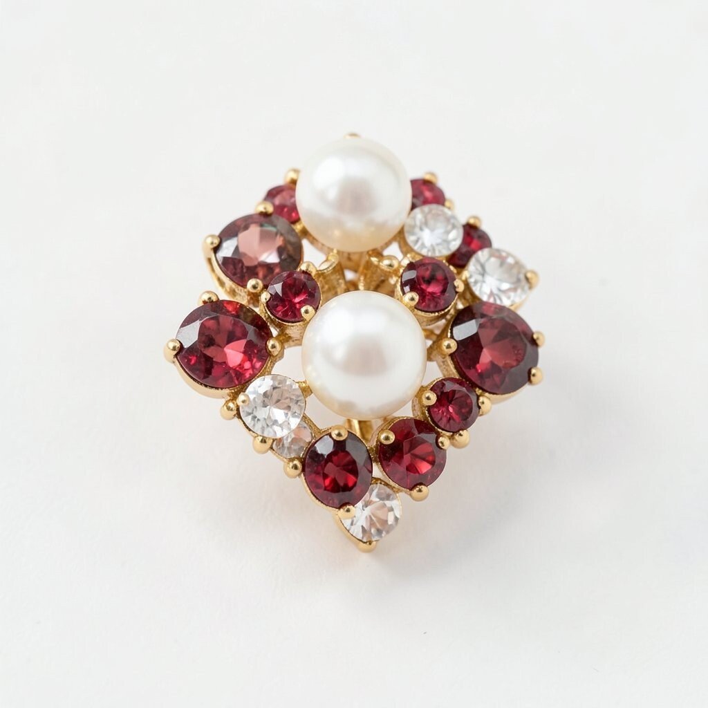 A pearl and garnet cluster brooch mixes soft shine with deep red sparkle. The round shapes create a full, lovely look that feels both fancy and warm.
