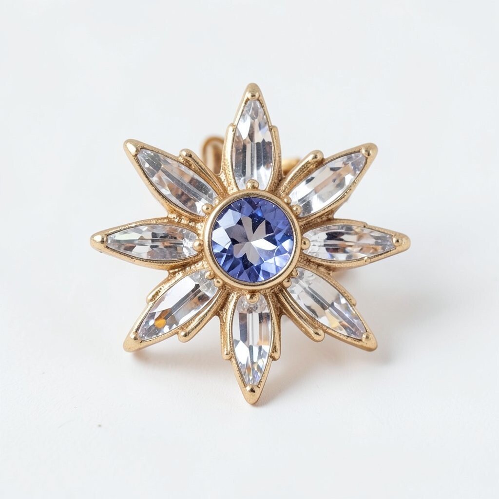 A sapphire starburst brooch shines with deep blue stones set in a bright, spiky shape. It looks rich and polished on coats, blazers, and even simple sweaters.