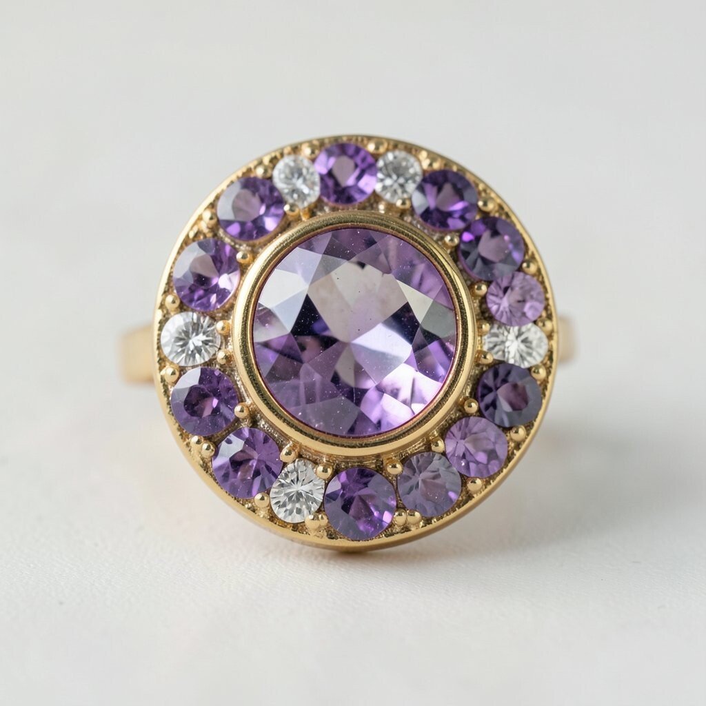A tanzanite halo brooch has a rich blue-purple center that feels luxurious and bright. The halo design makes the stone look even larger and more radiant.