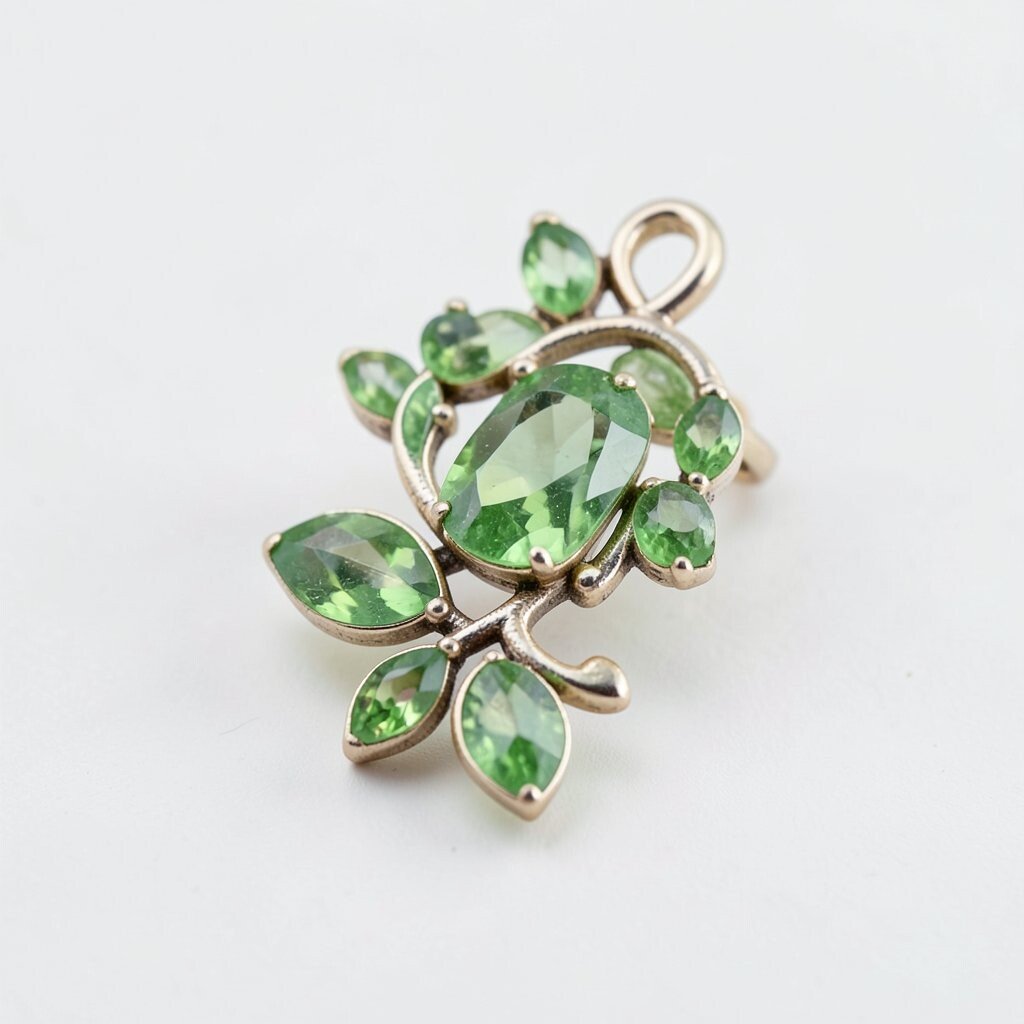 A peridot vine brooch winds across fabric like a tiny green branch. The bright stones give it a fresh, lively sparkle.
