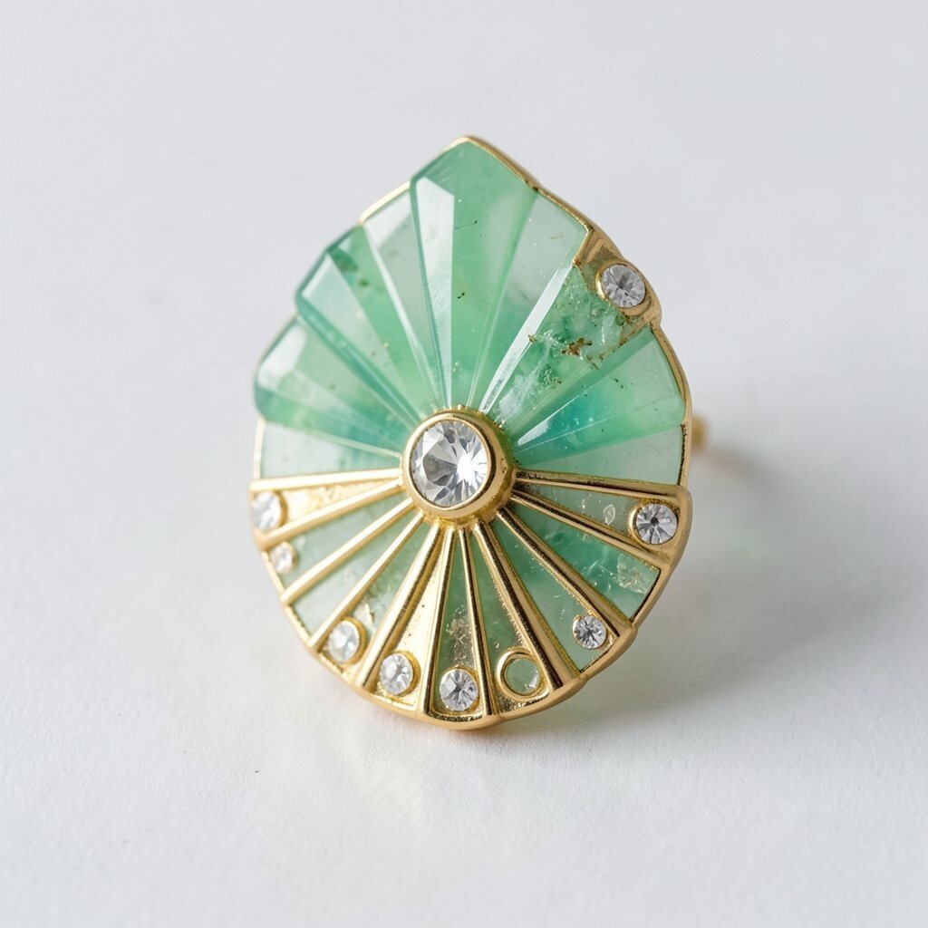 A jade fan brooch has a smooth, graceful shape with a calm green glow. It feels elegant and a little old-world in the best way.
