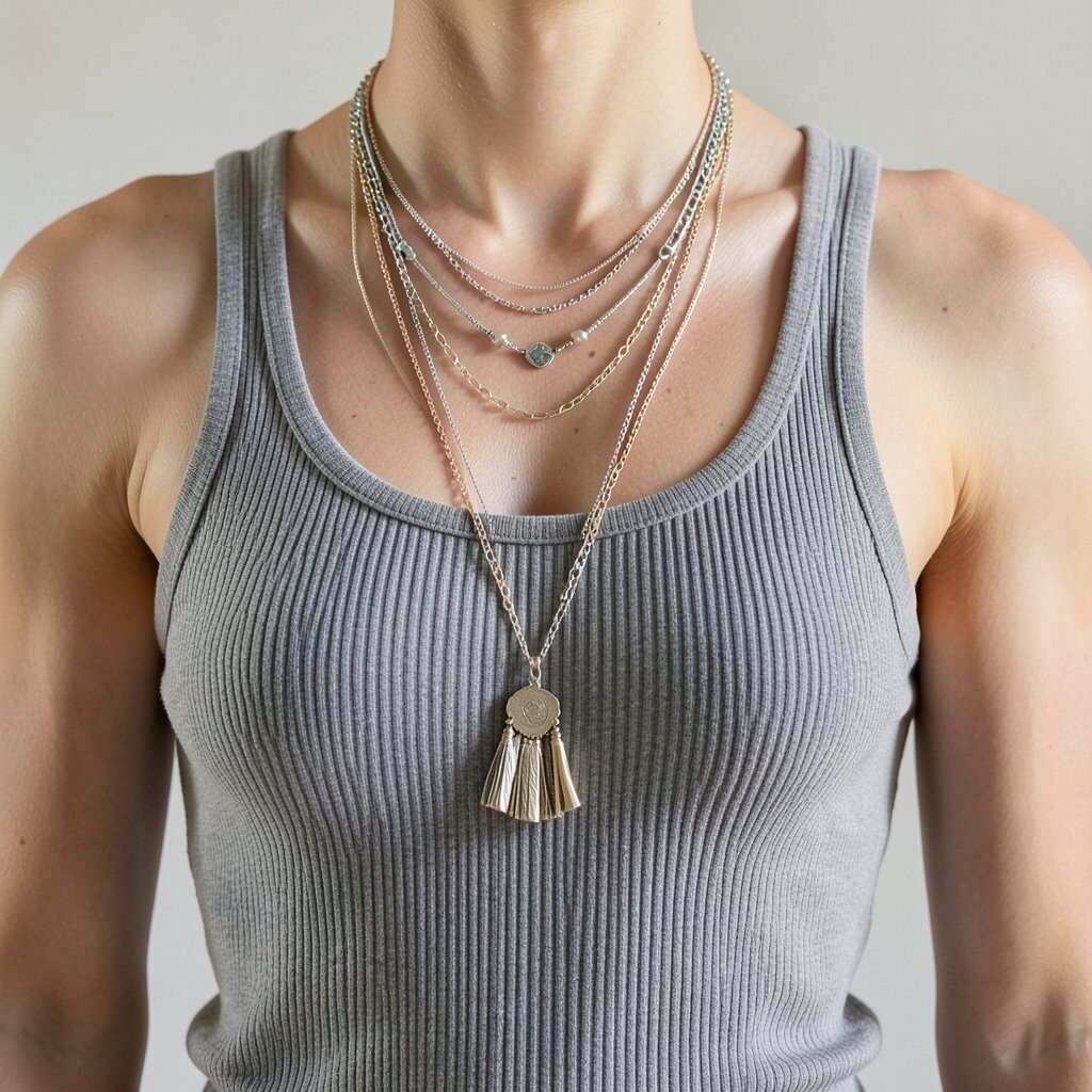 Enhance a simple ribbed tank with layered necklaces. This adds a touch of elegance to your outfit.