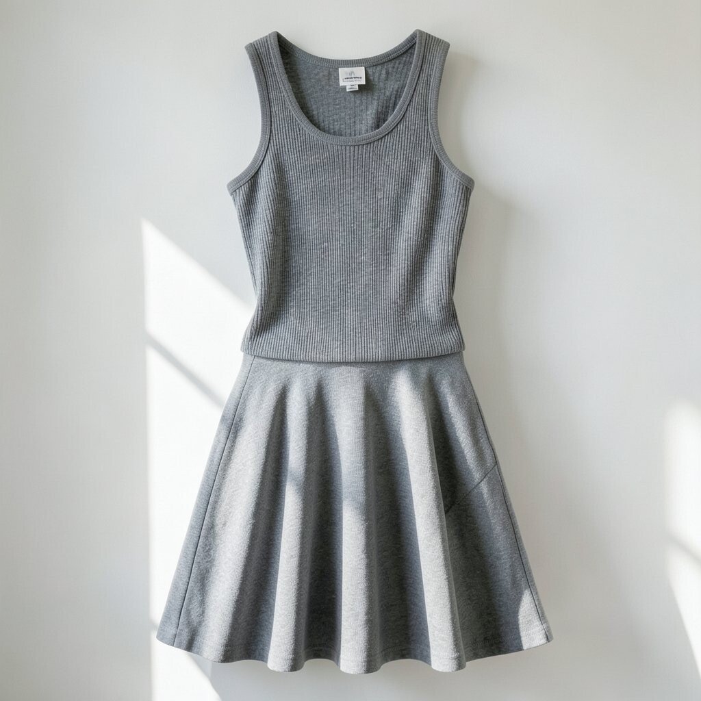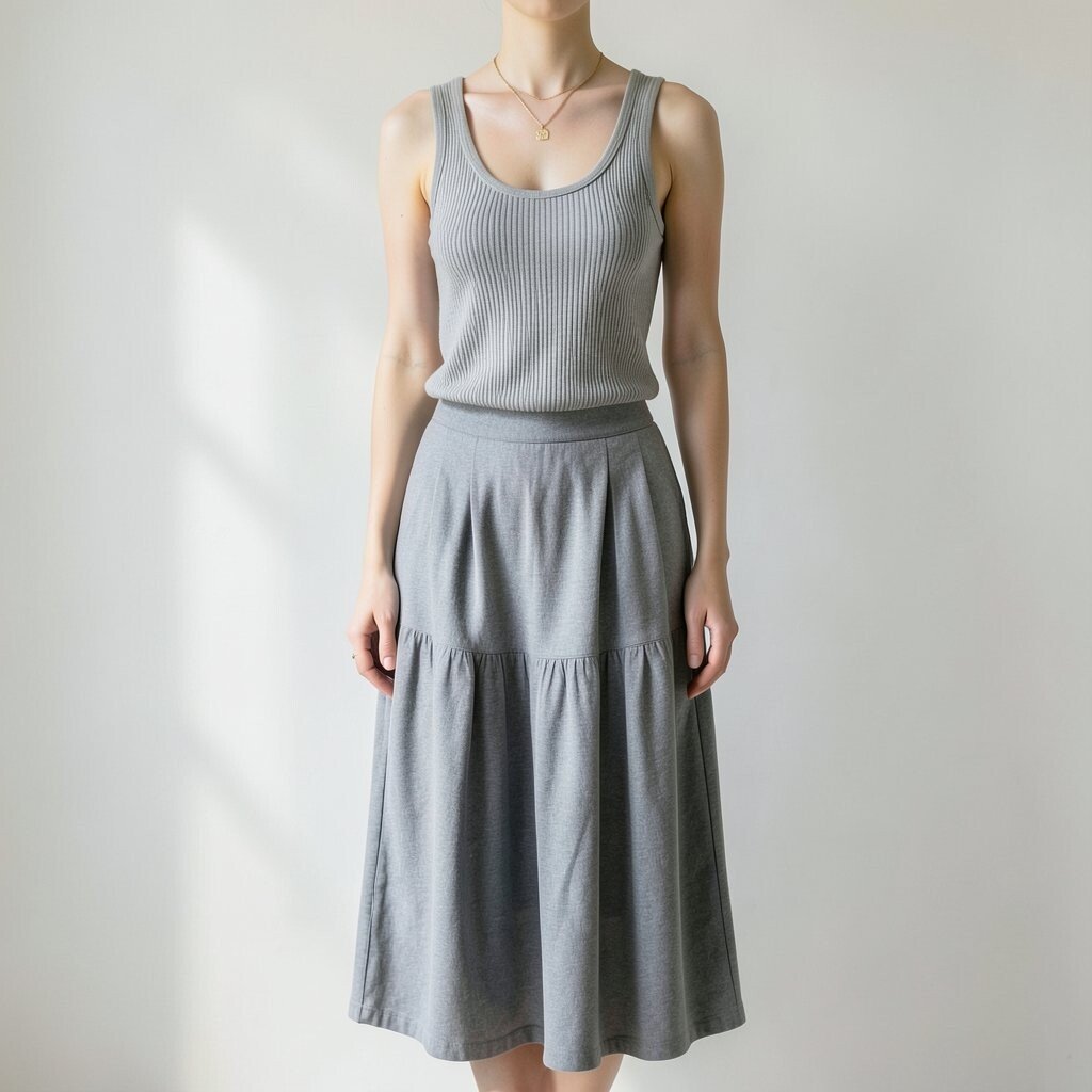 Pairing a ribbed tank with a high-low skirt creates a dynamic look. This combination offers a unique silhouette.