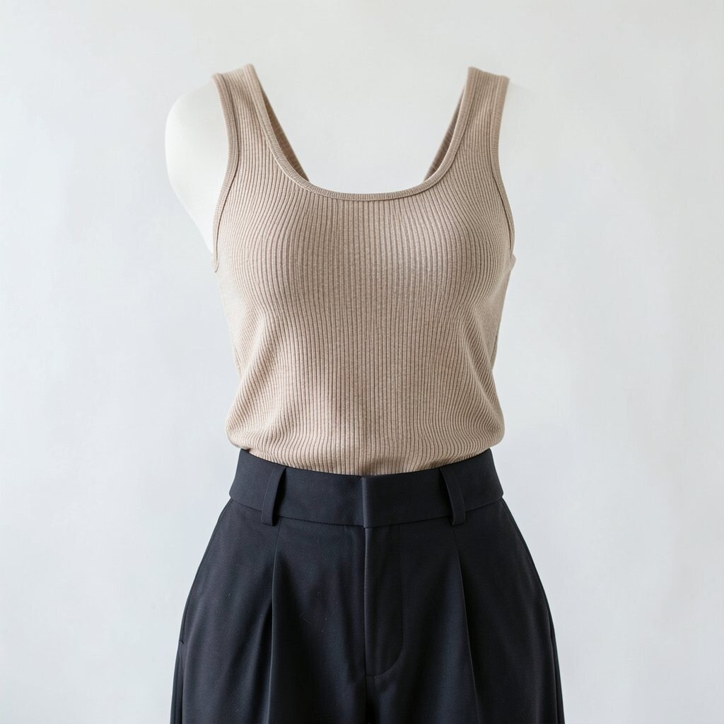 A ribbed tank tucked into tailored pants offers a sleek, professional look. This combination is perfect for office wear.