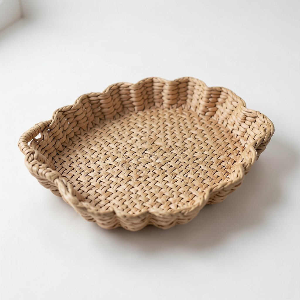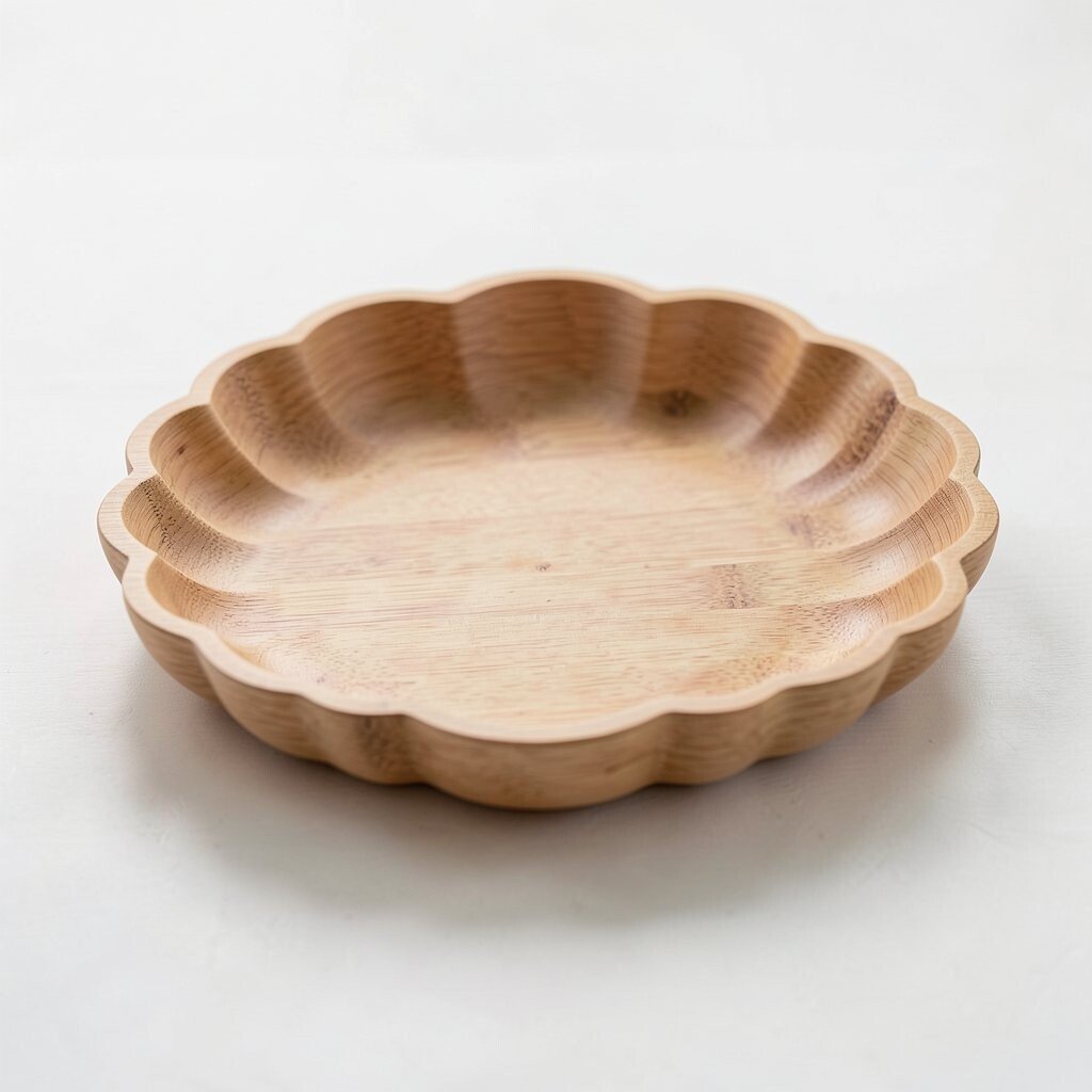 A bamboo tray with scalloped edges is eco-friendly and stylish. It adds a touch of nature to your home.