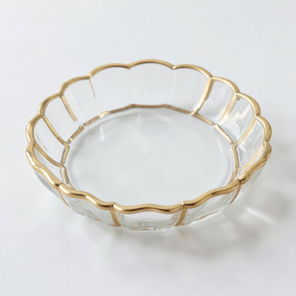 Envision a clear glass tray with delicate scallops and a gold trim. It exudes elegance and sophistication.