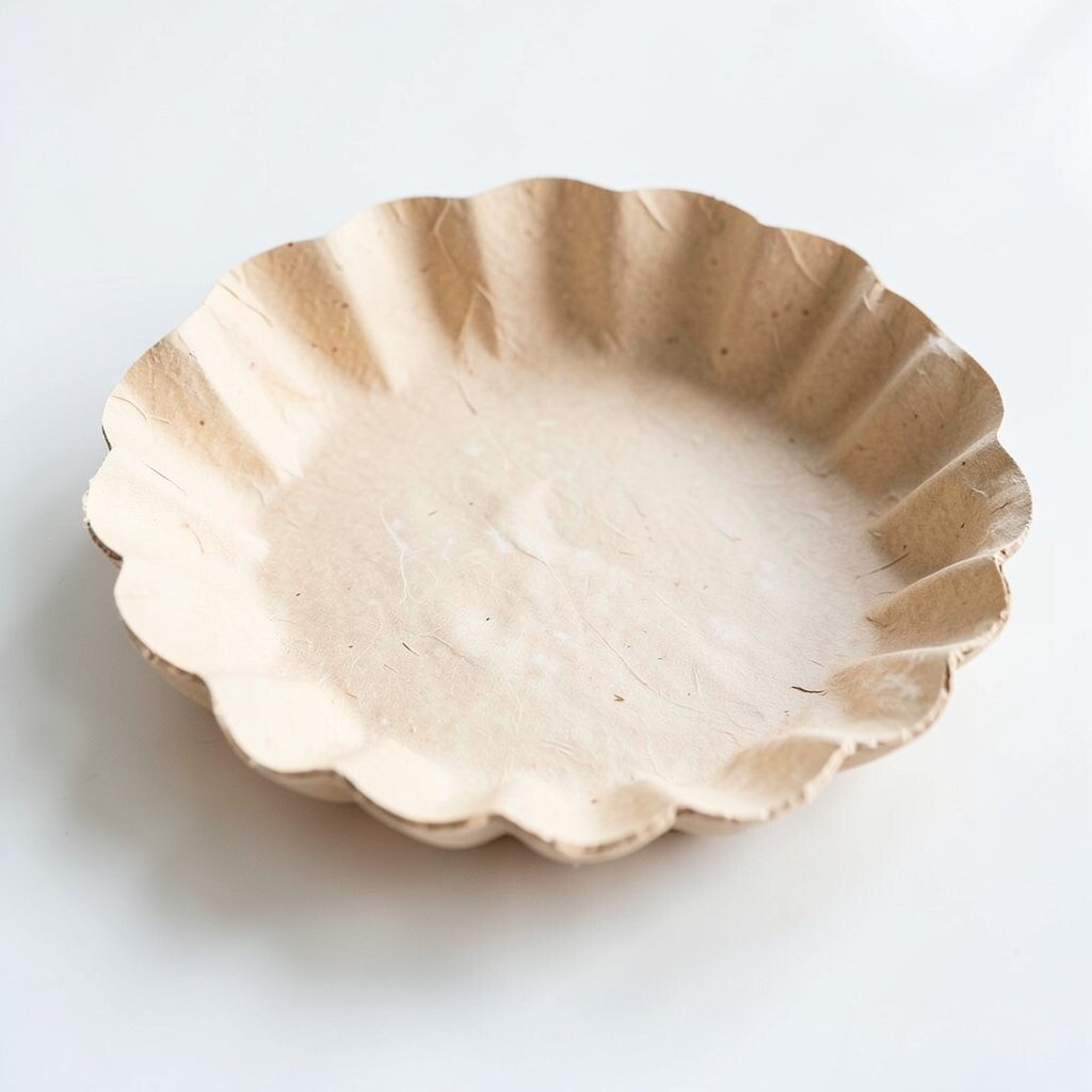A paper mache tray with scalloped edges is lightweight and eco-friendly. Its handmade nature gives it a unique character.