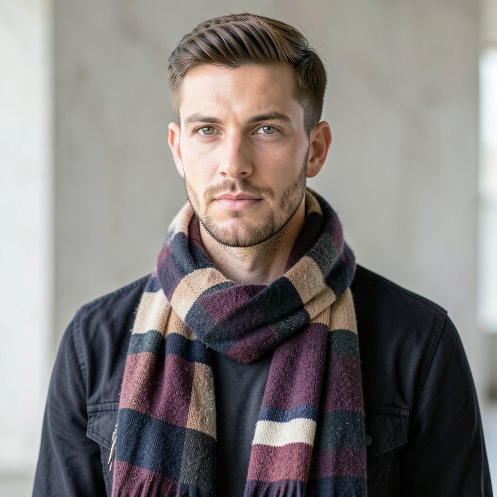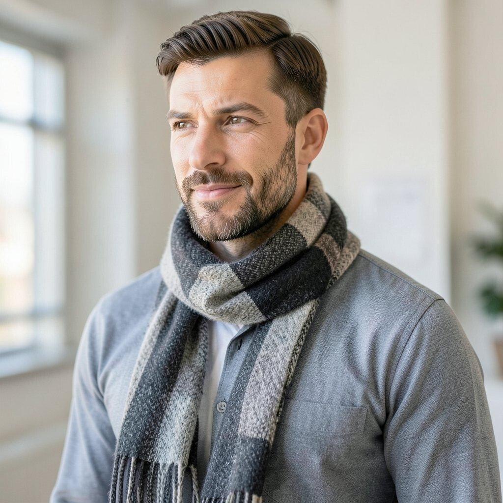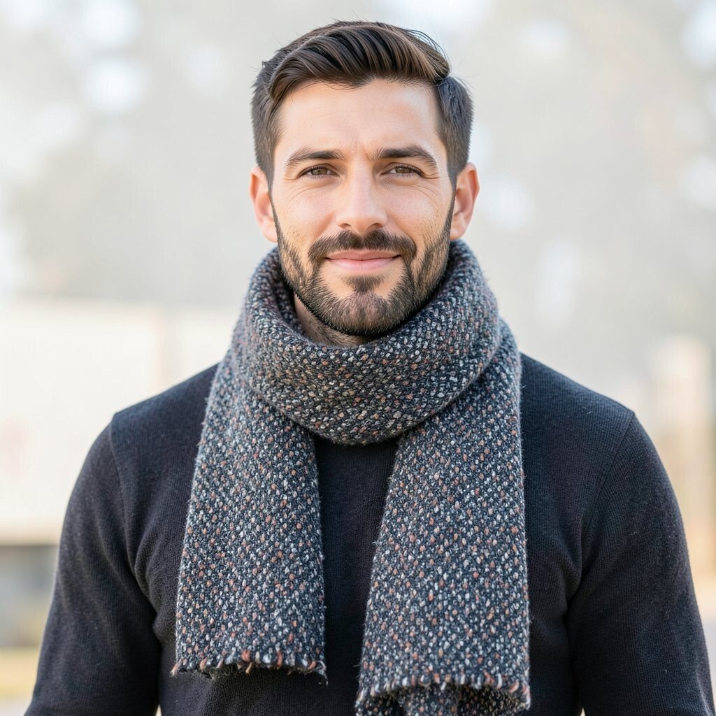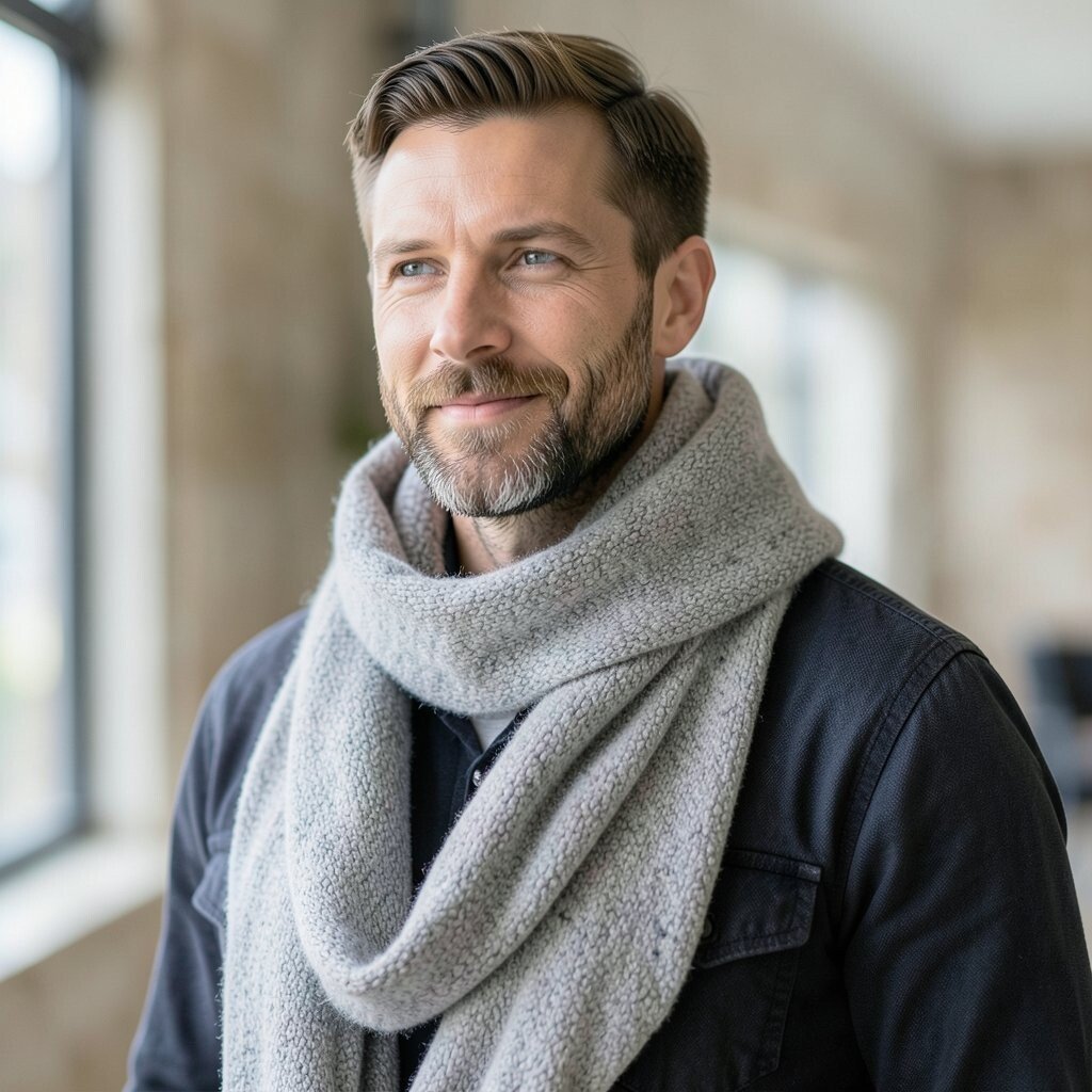 This style is nice for men who want subtle detail instead of loud print. Wear it with a wool coat or a simple puffer jacket, and let the texture do the talking. Bouclé scarves may cost more than basic knits, but they can make a simple outfit feel more thoughtful.