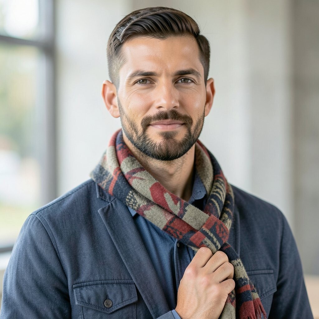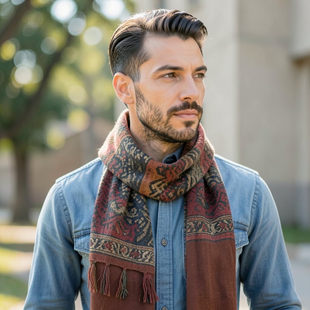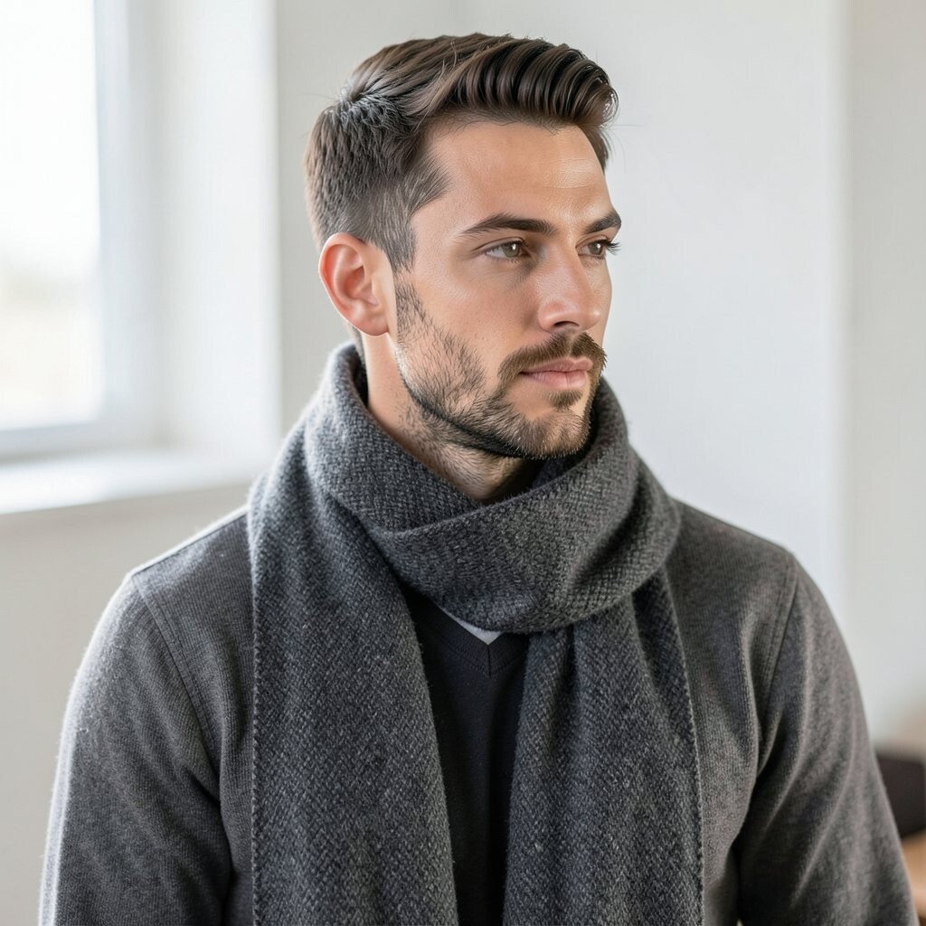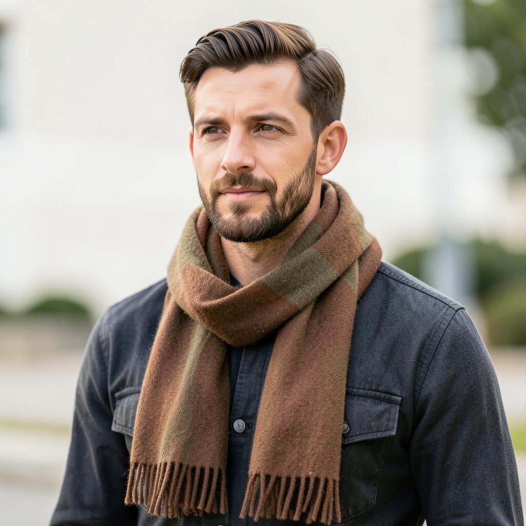 This style is nice for men who want subtle detail instead of loud print. Wear it with a wool coat or a simple puffer jacket, and let the texture do the talking. Bouclé scarves may cost more than basic knits, but they can make a simple outfit feel more thoughtful.
