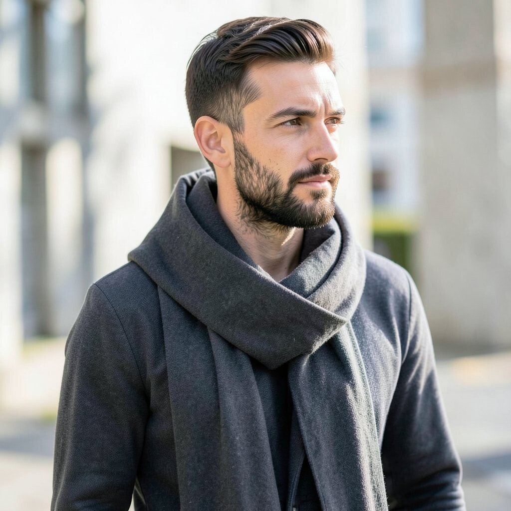 Black, gray, navy, and beige are easy picks because they match almost anything. This style is perfect for men who want a neat look without too much attention, and it can make a coat look more expensive. Solid scarves are often easy to find at low prices, especially in basic fabric blends.