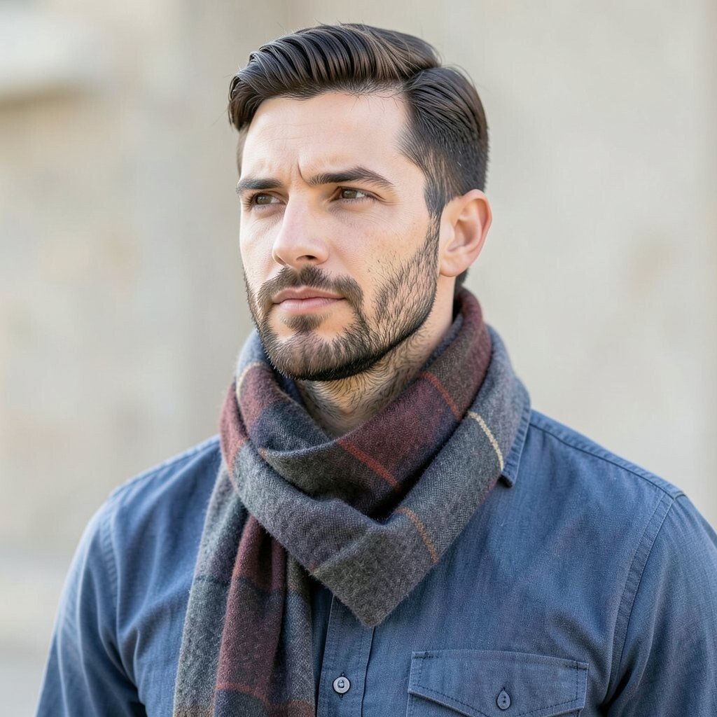 A tartan scarf brings bold lines and a strong classic feel. It looks polished, smart, and full of tradition without feeling old.