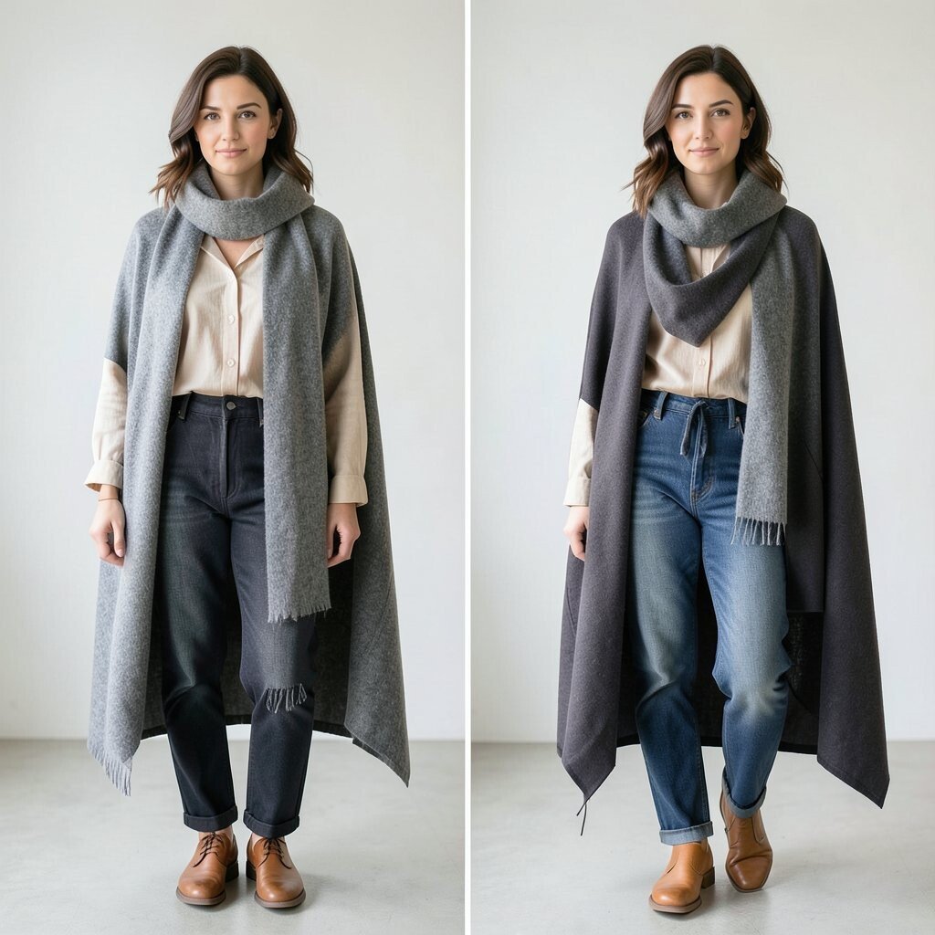 Turn a large scarf into a poncho by draping it over your shoulders. This look adds warmth and style, perfect for transitional weather. Choose a reversible scarf for added versatility.