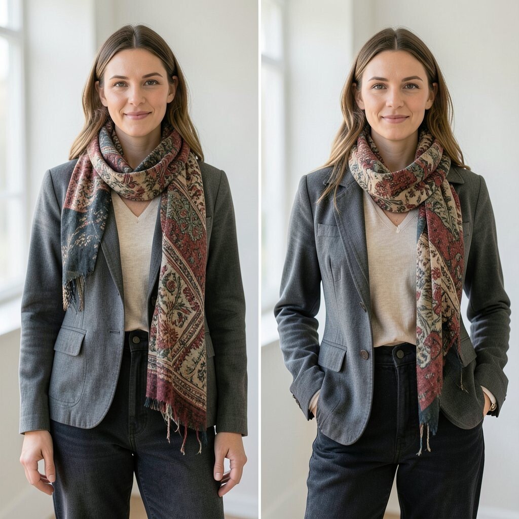 Choose a scarf with subtle shimmer or intricate detailing for a luxurious touch. It’s a simple yet effective way to add elegance to any outfit.