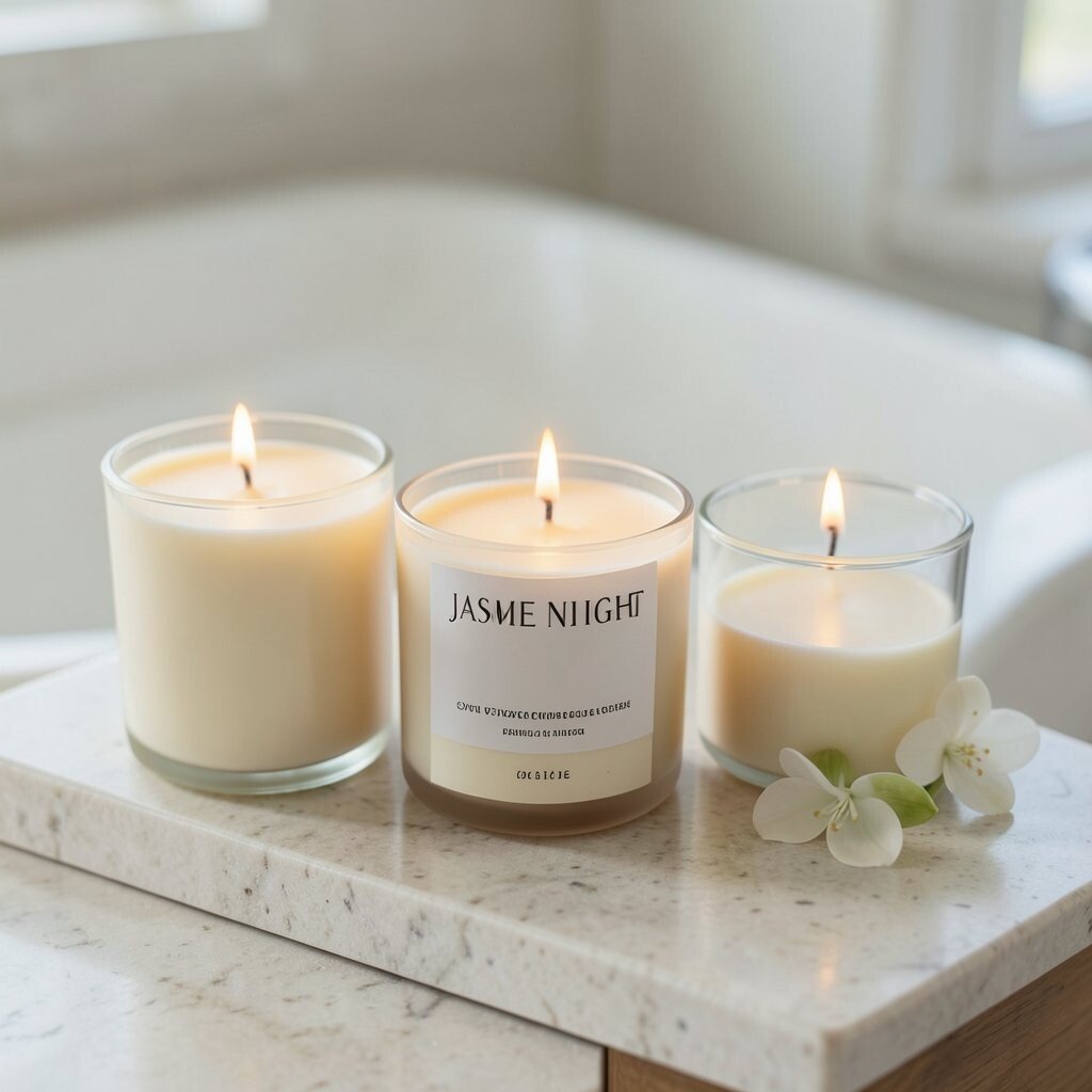 Jasmine candles have a sweet floral scent that feels soft and dreamy. Their gentle light can make a bathroom seem calm and a little fancy.