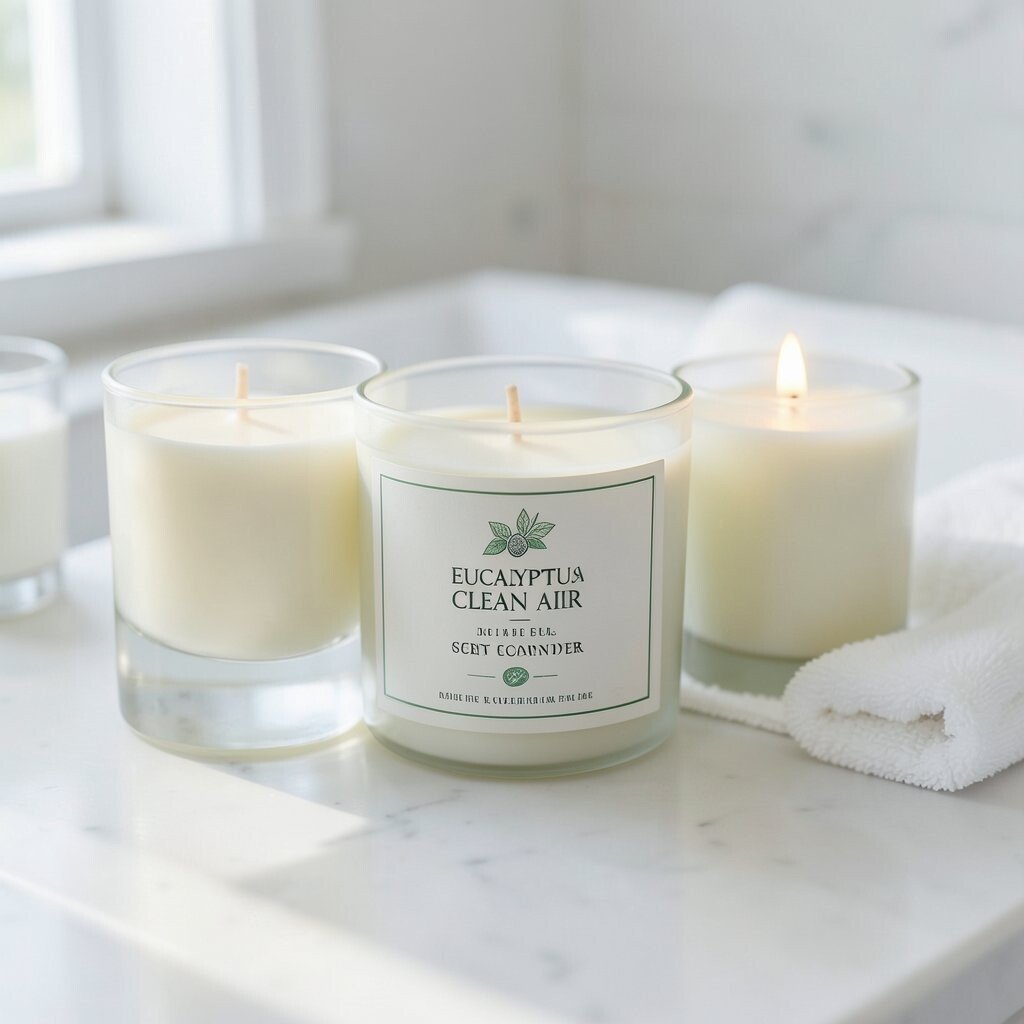 Eucalyptus candles smell sharp, cool, and clean, almost like a fresh shower. Their pale green look feels neat and modern next to bath towels and soap.