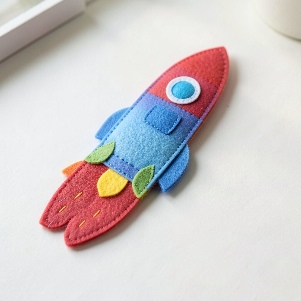 Use silver, red, blue, or black felt for a bold outer-space style. Add stitched windows and stars to make the design more detailed. This project is a smart low-cost craft because the pieces are small and simple.