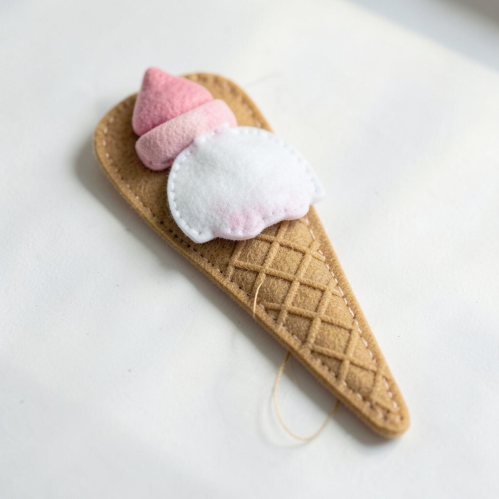 Use tan felt for the wrapper and bright felt for the icing. Tiny stitched sprinkles or a cherry on top make the design pop. This craft is low cost and can be made from small felt leftovers.