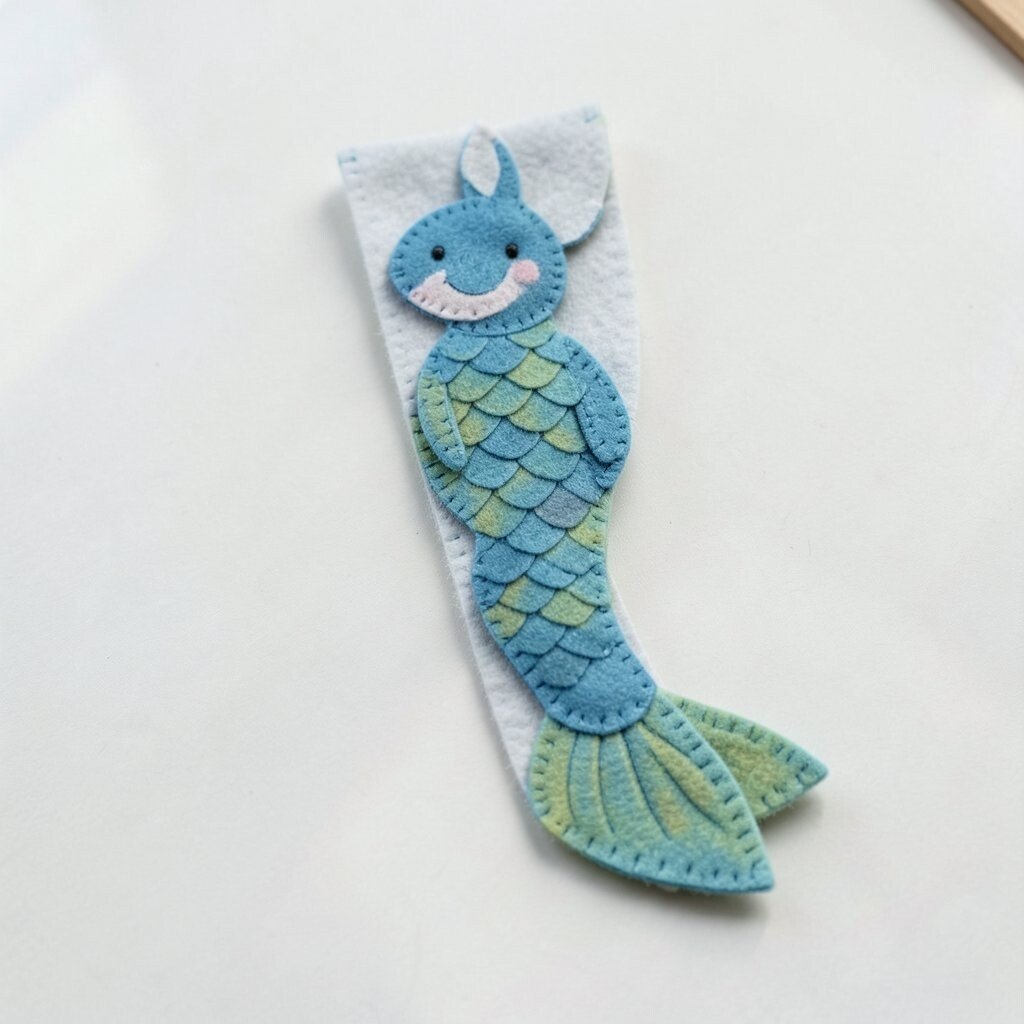 A mermaid tail bookmark brings a splash of fantasy to any book. The curved tail and scalloped fin look lovely in bright or shimmering felt.