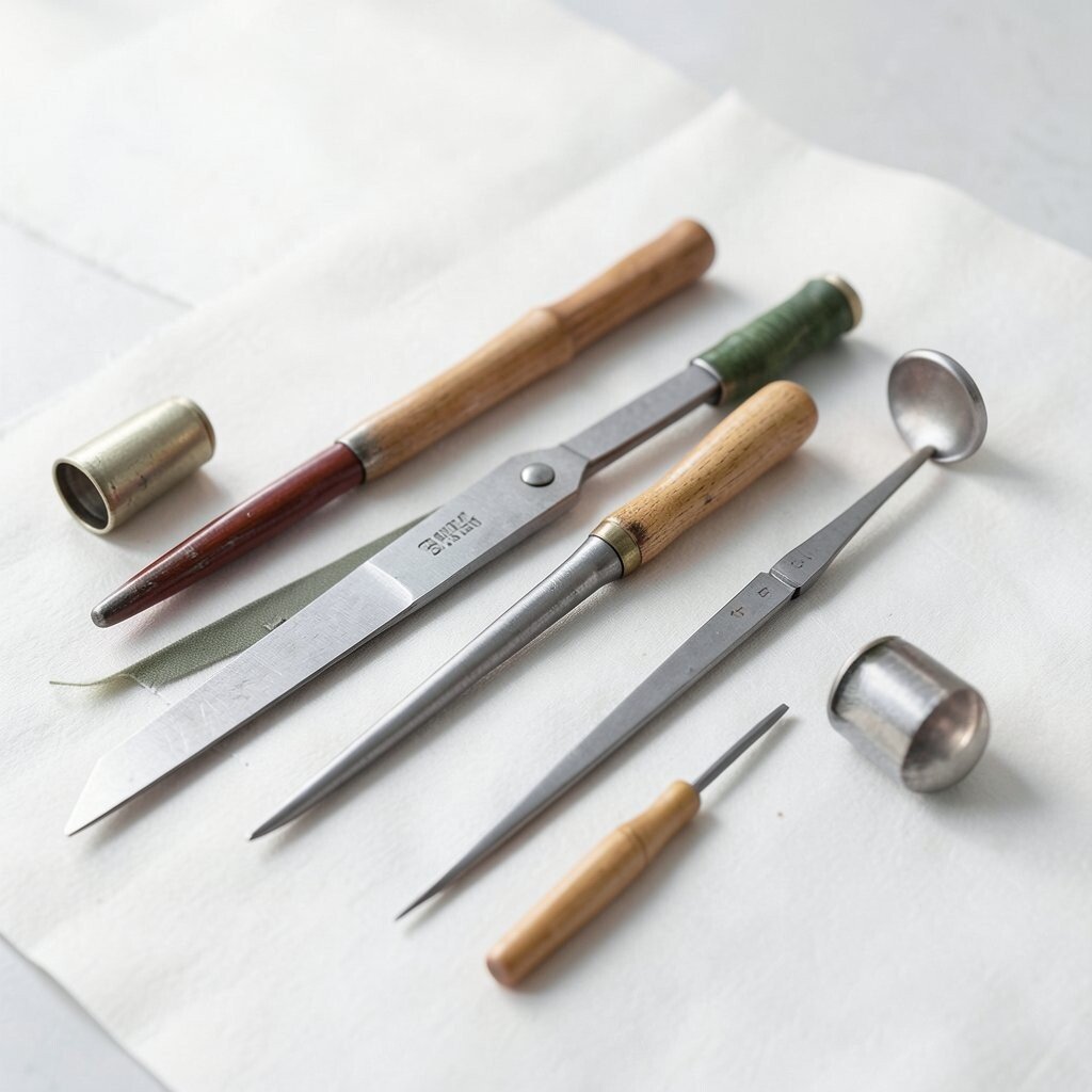 Thimbles come in different sizes and materials, like metal or leather. Choose one that fits snugly on your finger.