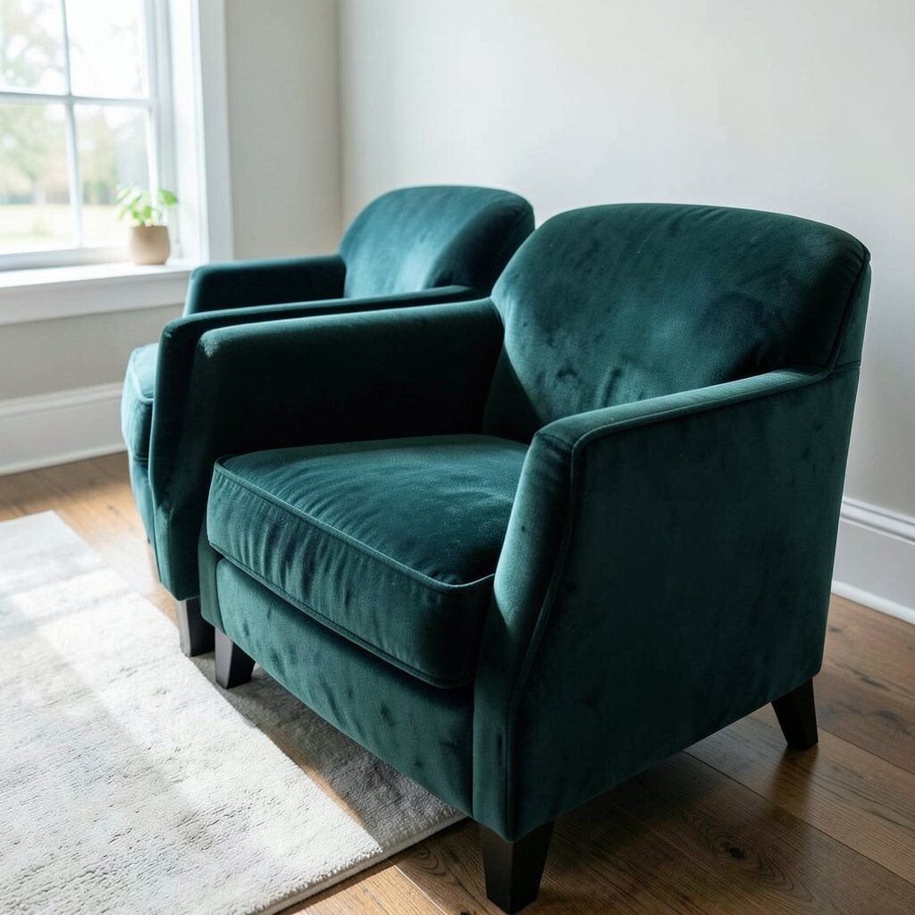 Velvet chairs and benches often become the star of a room. Their soft surface and deep color make them easy to notice.