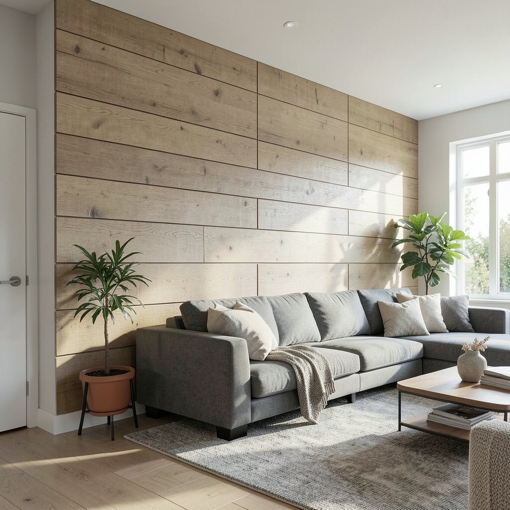 Create a unique feature wall in your living room. Slat wall panels can hold art, photos, and decor.