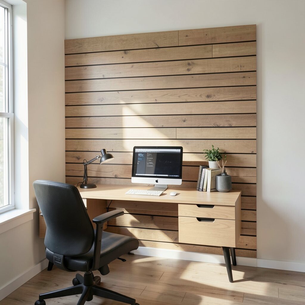 Maximize productivity with a slat wall panel in your home office. It offers a clean, organized space for all your work essentials.