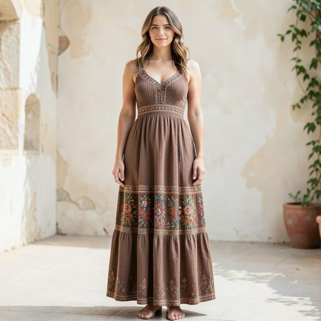 This boho-inspired smocked maxi dress features flowing fabric and earthy tones. It is ideal for casual outings and relaxed gatherings.