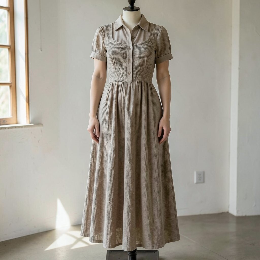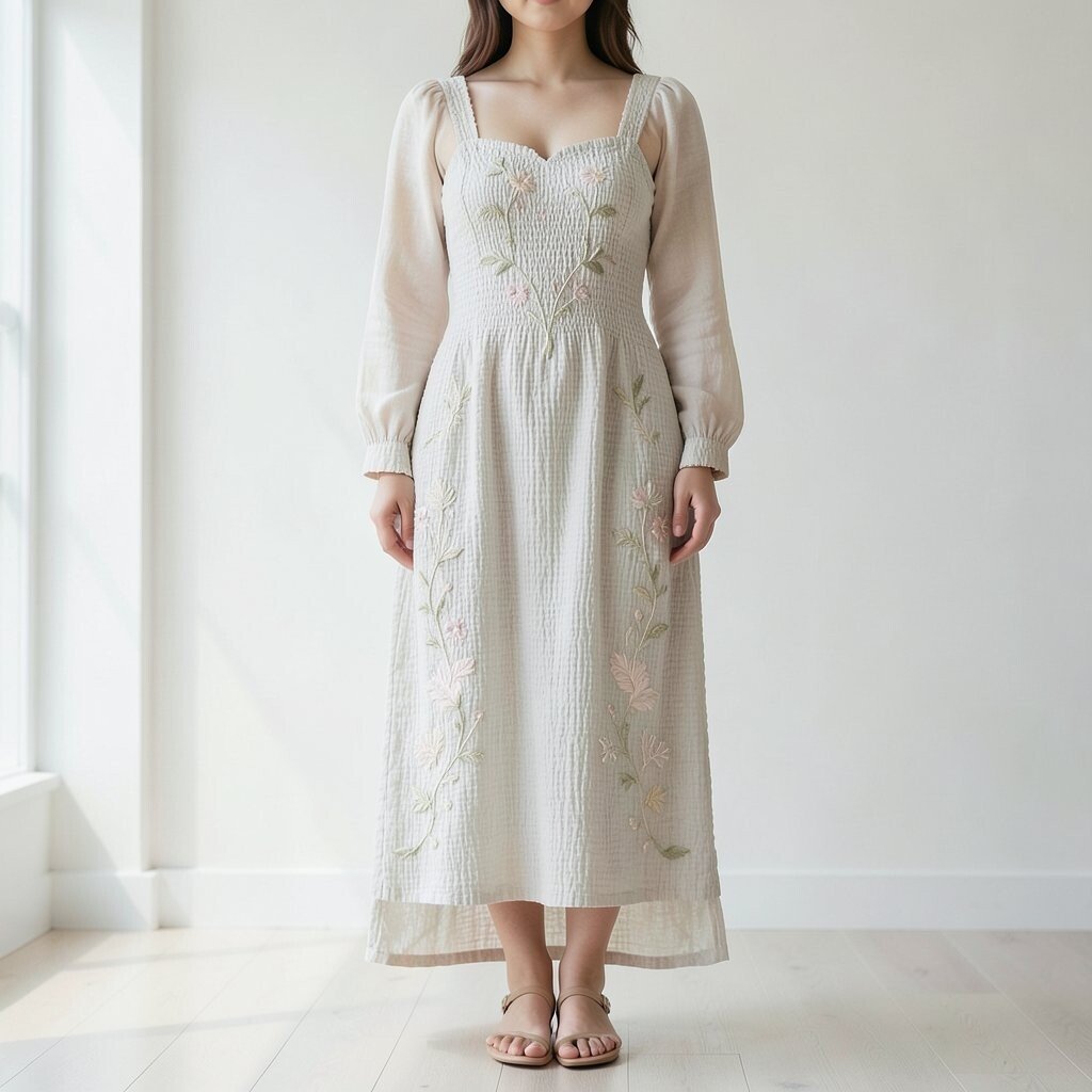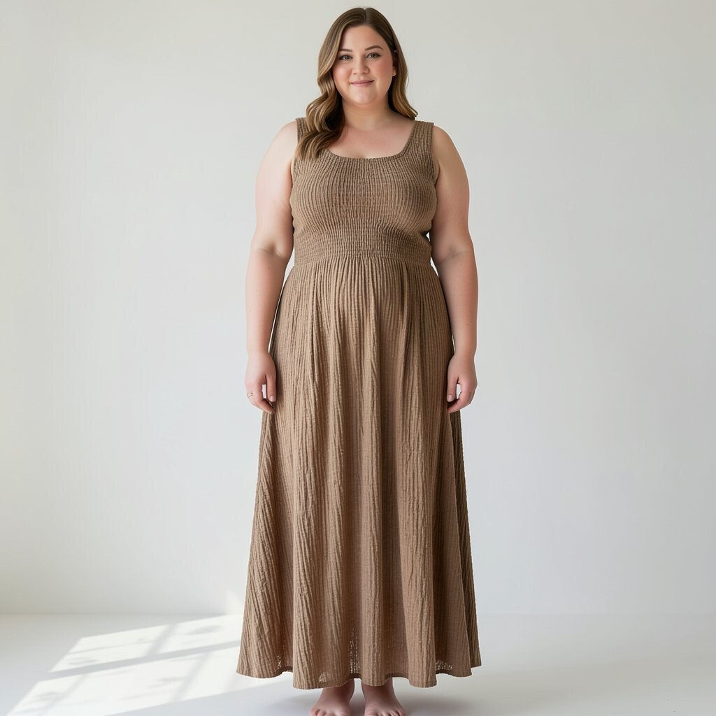 Rich in color and warmth, an earthy-toned smocked maxi dress is perfect for autumn. Its muted palette evokes a sense of calm and balance.