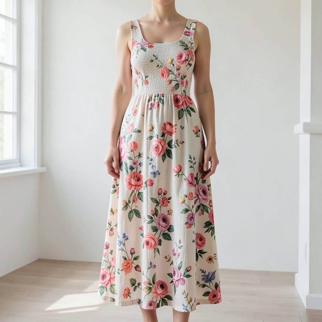 Imagine a garden blossoming on fabric, a floral smocked maxi dress brings nature’s beauty to your wardrobe. Its vibrant patterns and soft hues make it perfect for any sunny day.