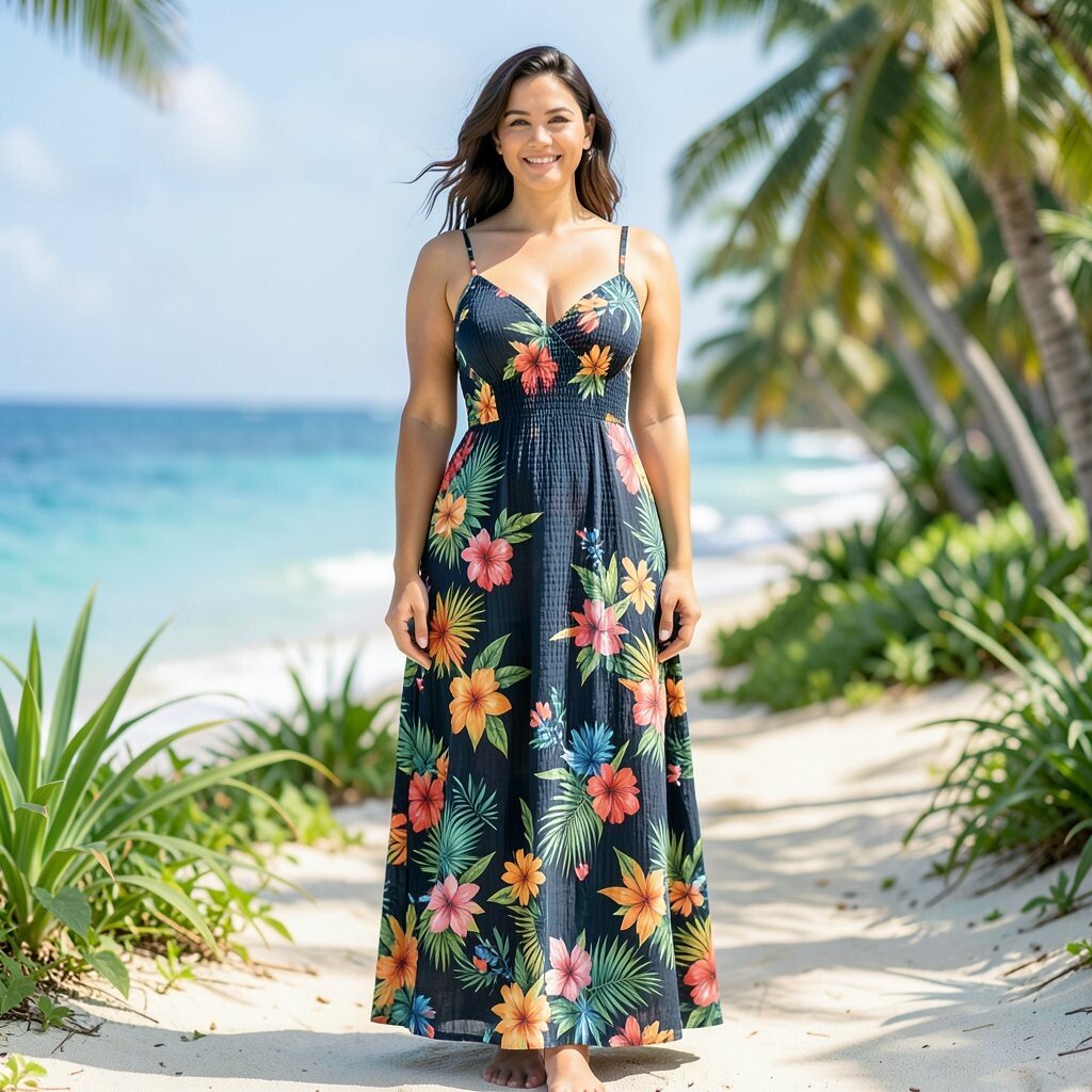 Bright colors and tropical patterns make this smocked maxi dress a standout piece. Perfect for beach vacations or summer parties, it exudes a festive feel.
