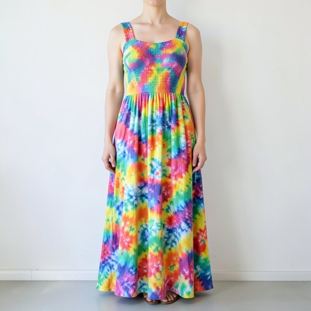 Embrace the playful side of fashion with a tie-dye smocked maxi dress. Its kaleidoscope of colors is sure to turn heads wherever you go.