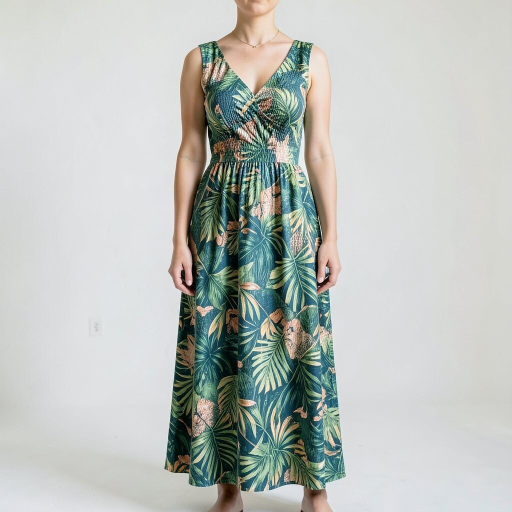 Bring the tropics to your wardrobe with a leaf-patterned smocked maxi dress. It’s perfect for vacations and summer barbecues.