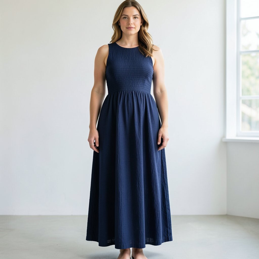 Navy blue smocked maxi dresses bring a nautical vibe to your wardrobe. They’re perfect for sailing trips or seaside dinners.