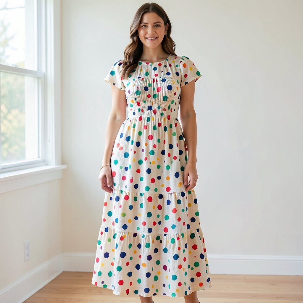 Polka dot smocked maxi dresses bring a playful and retro vibe to your style. They’re perfect for casual weekends and fun outings.