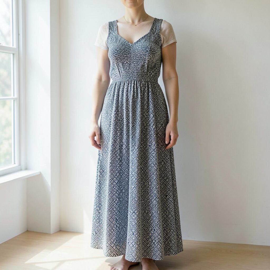 Geometric patterns bring a modern twist to the smocked maxi dress. They’re perfect for those who love contemporary styles.