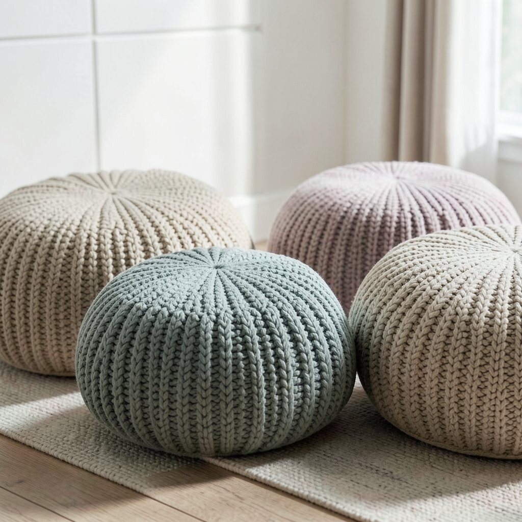 Knitted poufs are fun and functional. They add a touch of whimsy and are perfect as footrests or extra seating.