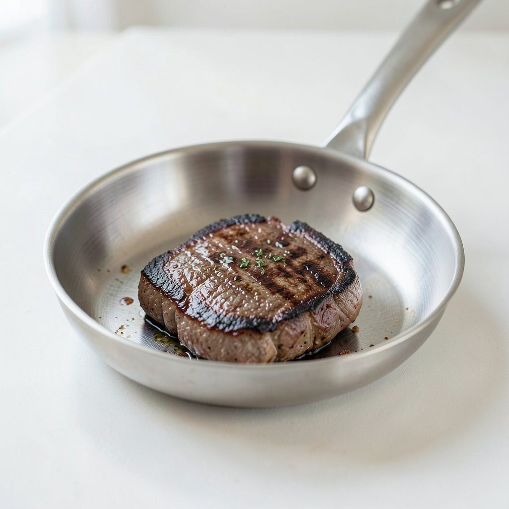 A stainless steel pan is perfect for getting a beautiful sear on a steak. The high heat capability allows for a crusty exterior while keeping the inside juicy.