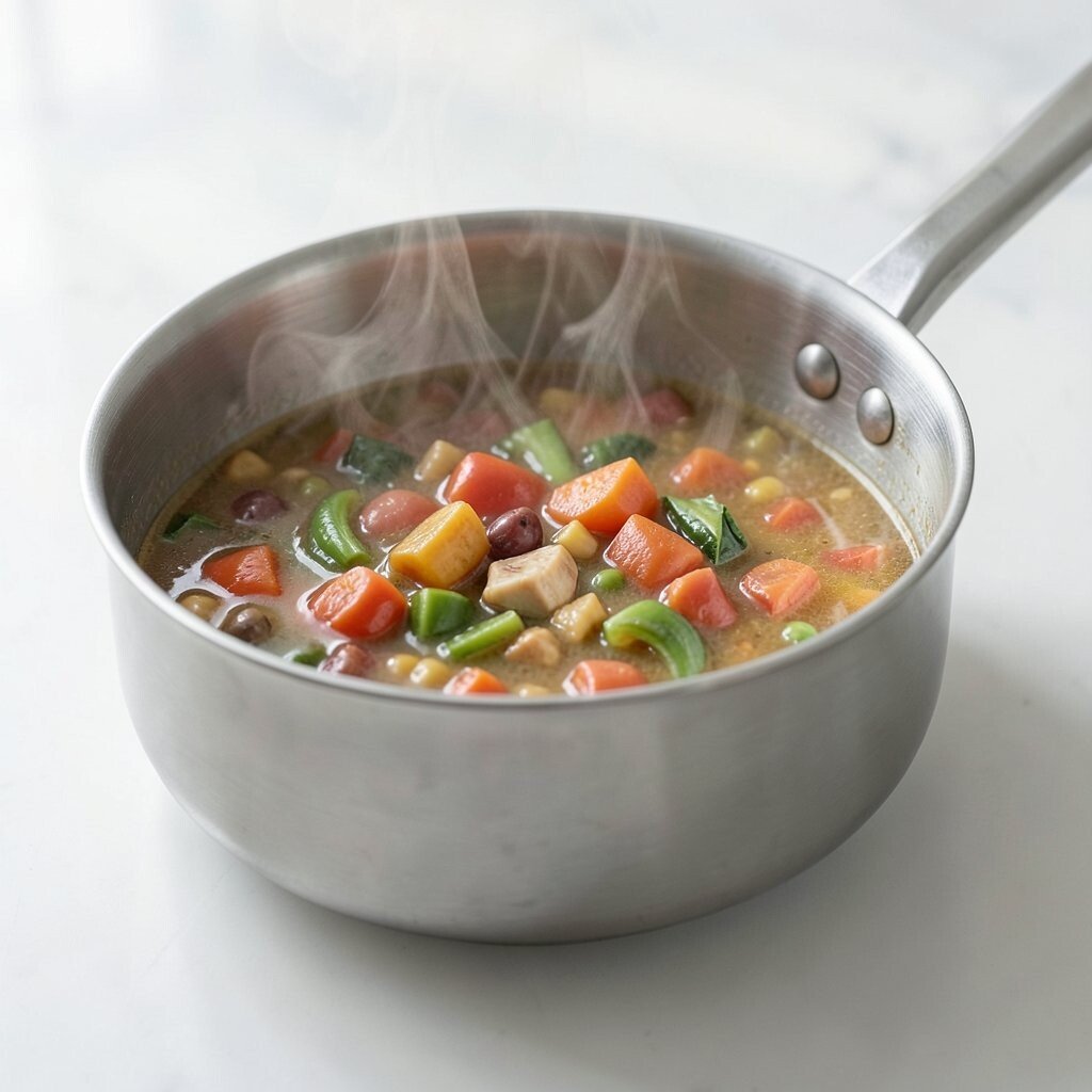 Simmering soups and stews in a stainless steel pan allows for even heat distribution, ensuring consistent cooking. The pan’s size accommodates large batches.